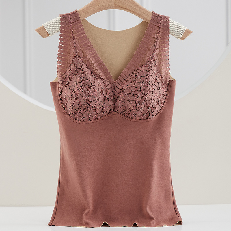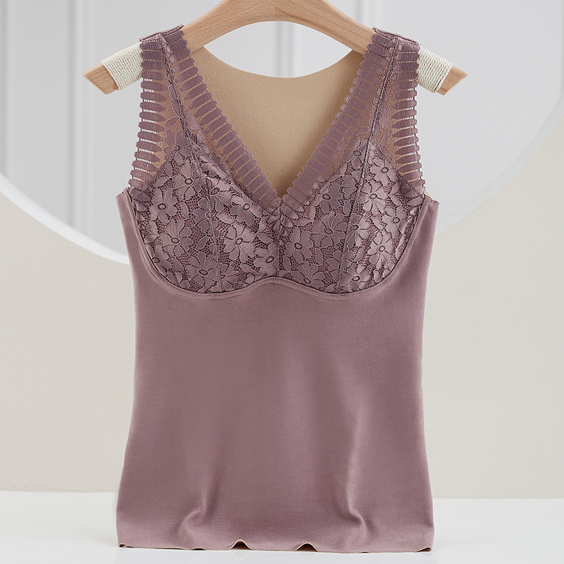 秋冬新款保暖内衣女 性感蕾丝V领带胸垫修身无痕发热打底保暖背心