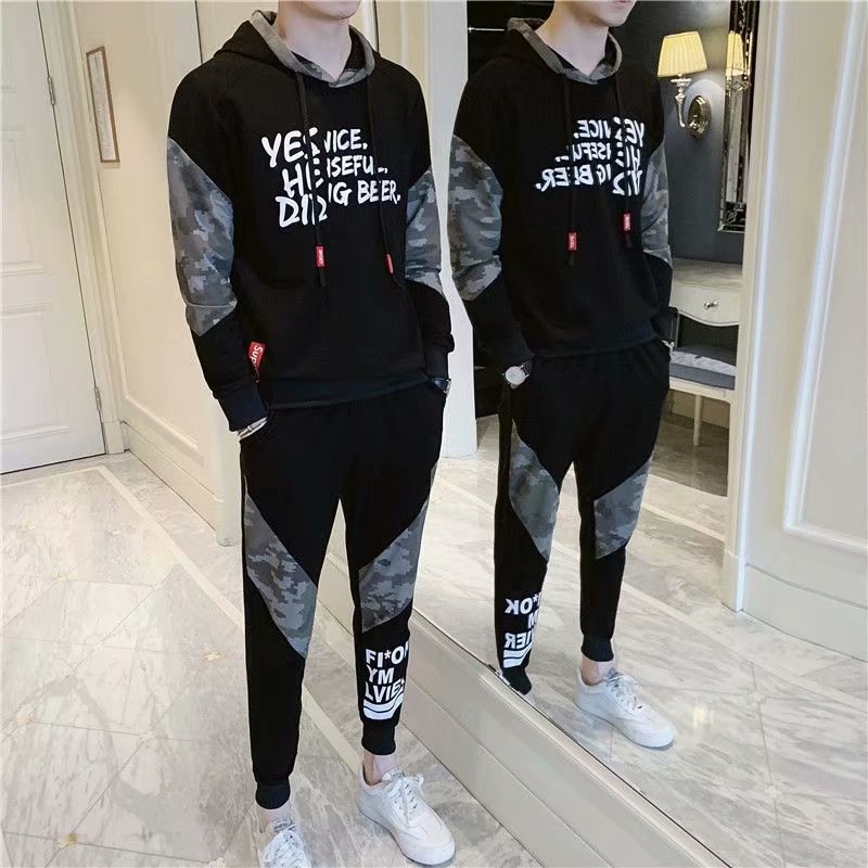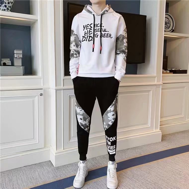 裤子上衣套装运动服春秋新款潮流男士休闲连帽长袖卫衣长裤两件套
