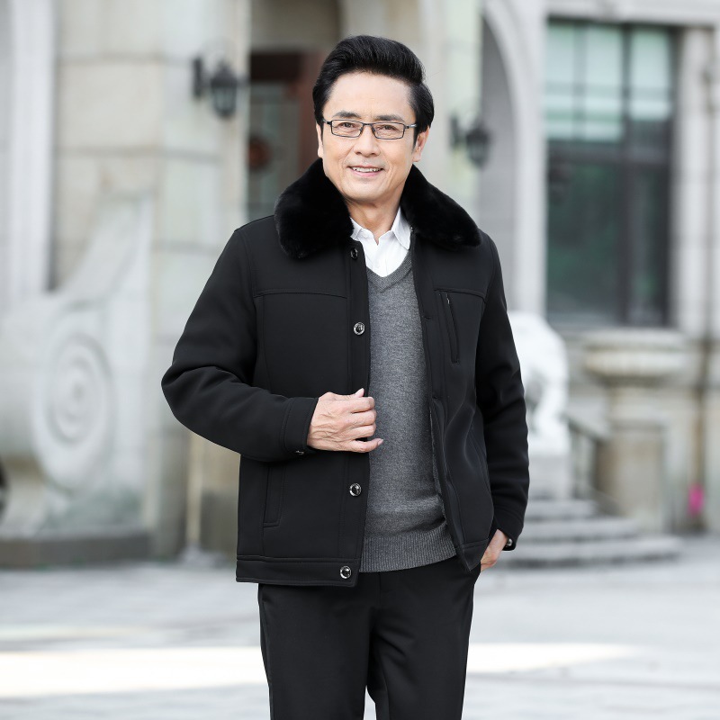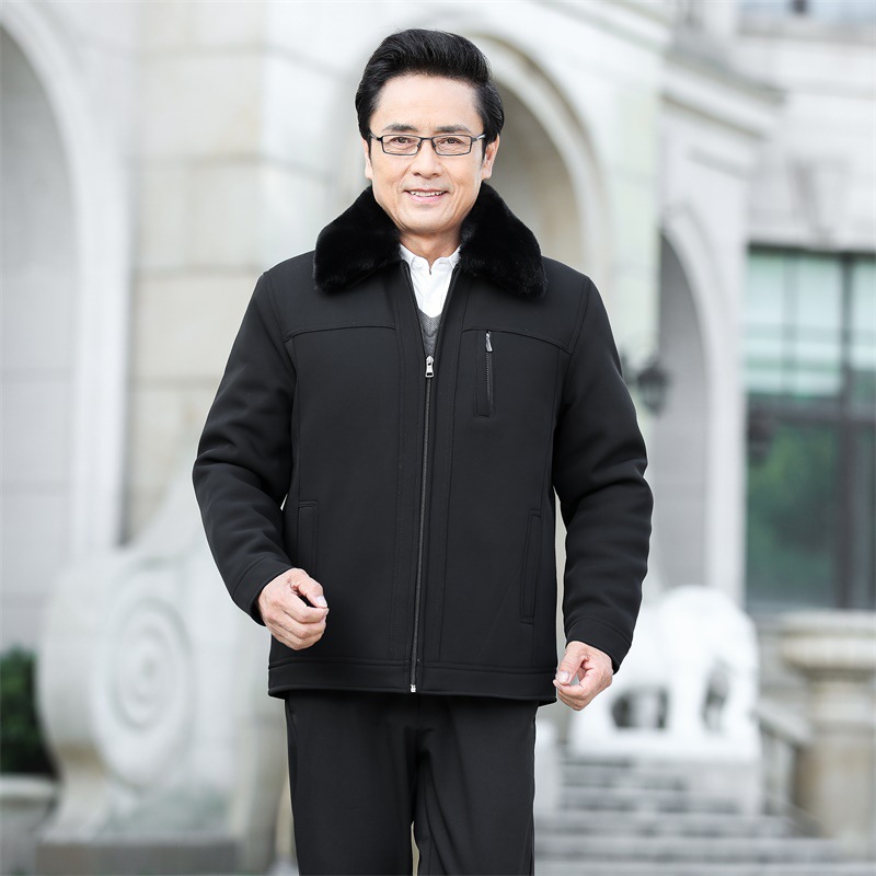 秋冬季爸爸加绒外套可拆卸毛领中老年男士棉衣加绒加厚款保暖防风