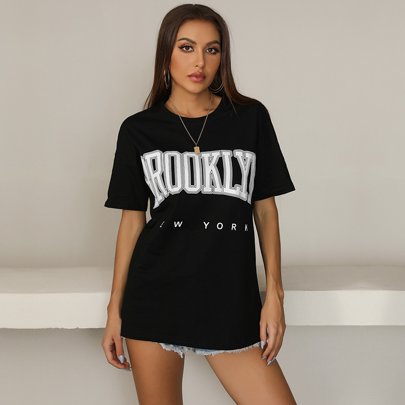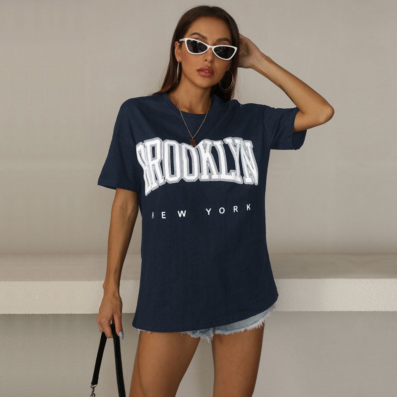 欧美跨境夏季新款女装字母圆领运动T恤短袖亚马逊外贸爆款宽松t恤