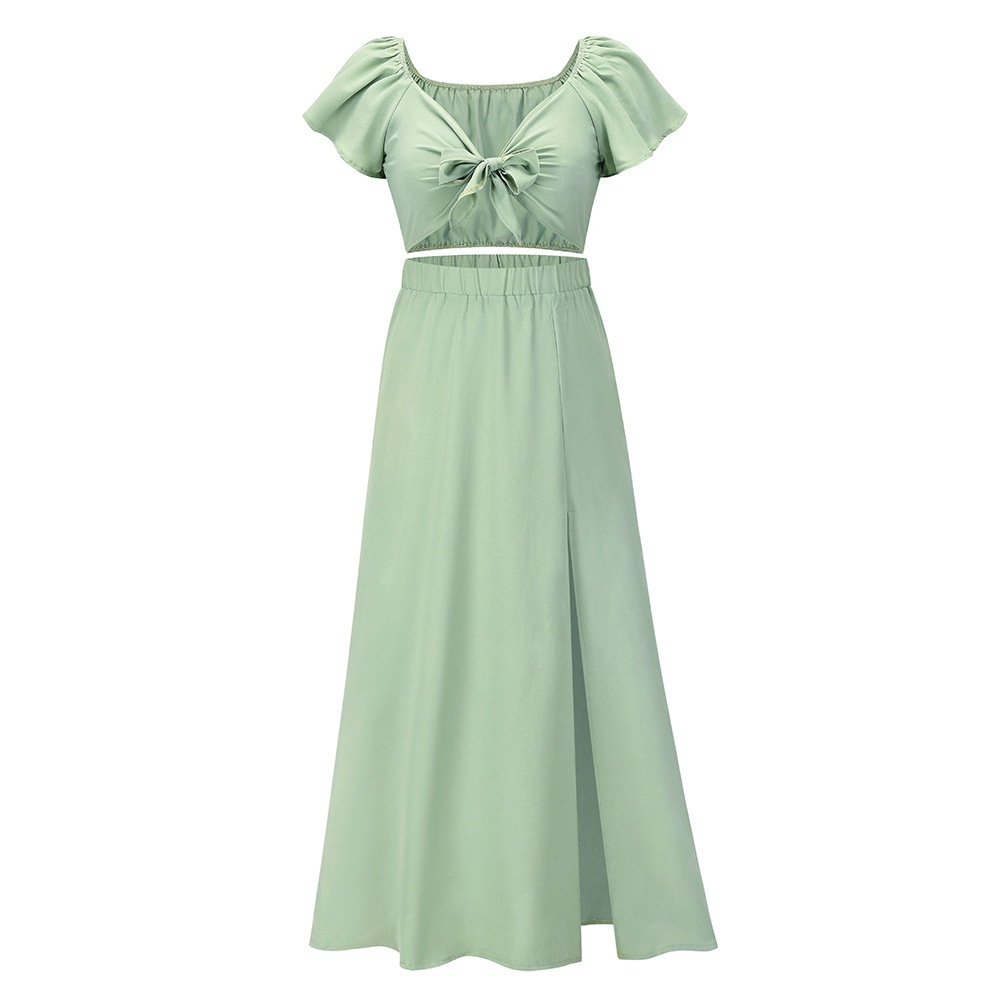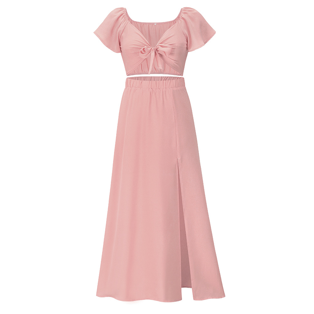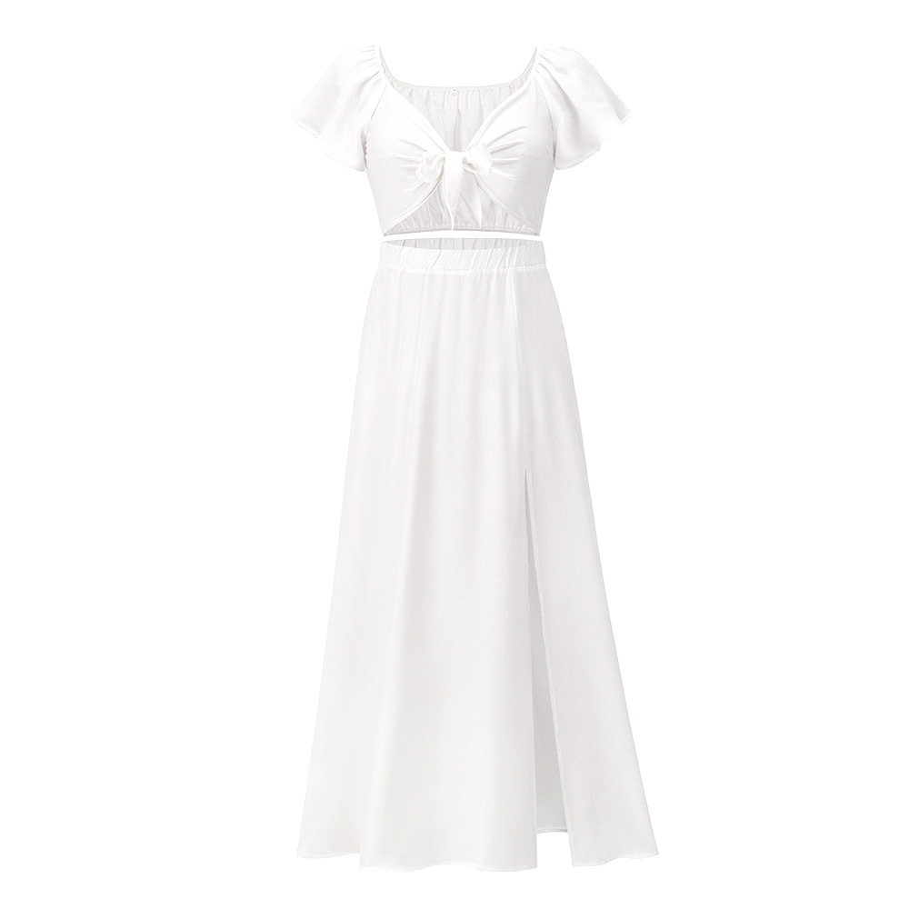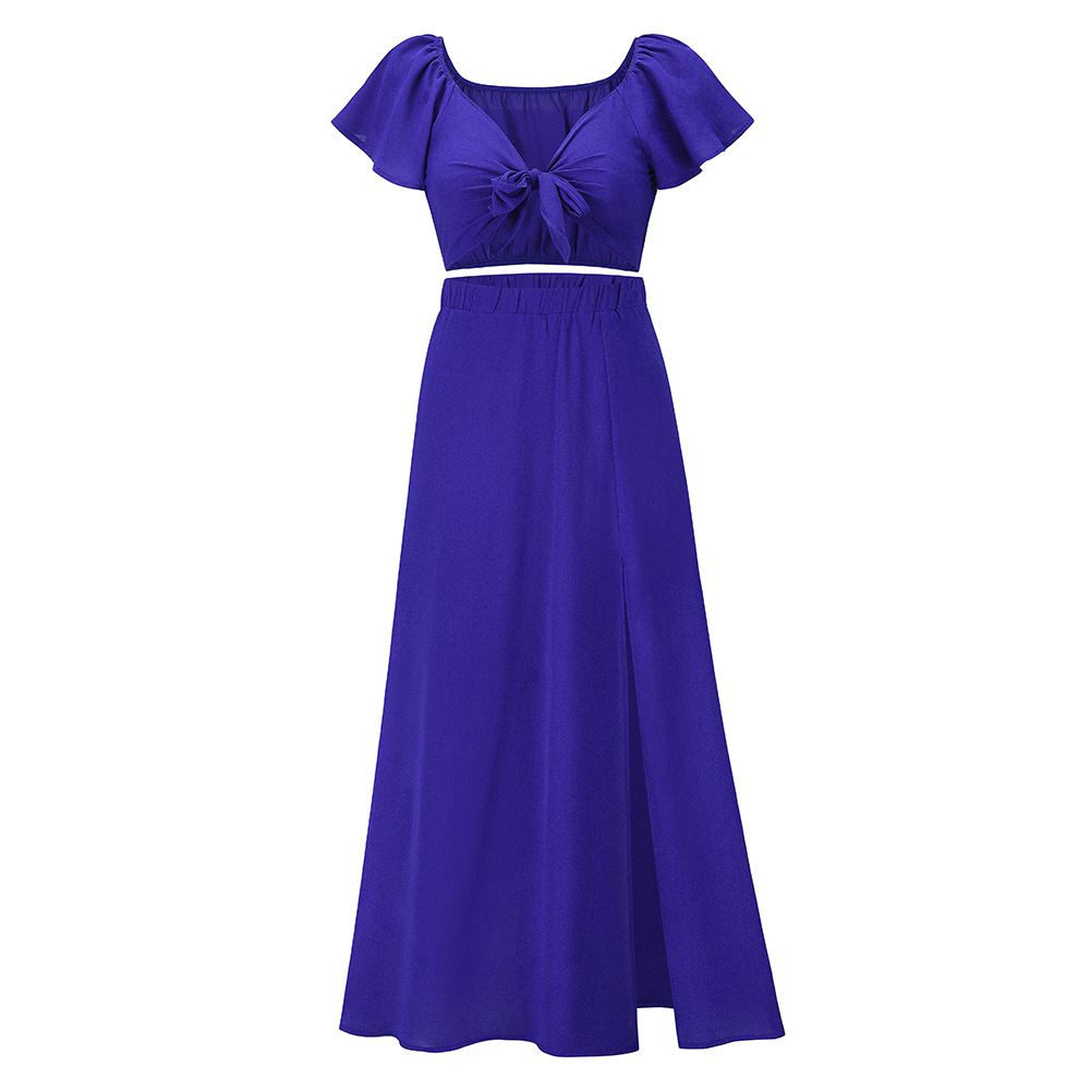 欧美外贸春夏季套装休闲沙滩雪纺绑带上衣直筒开衩裙时尚新款套装