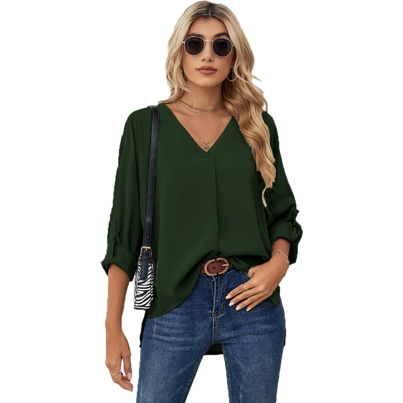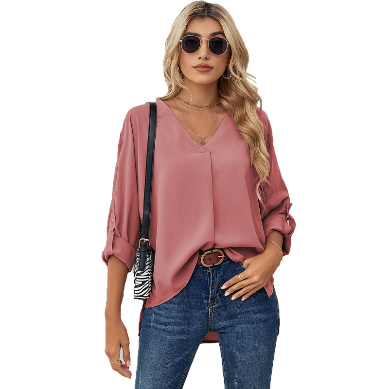 欧美雪纺衫女秋冬2022亚马逊纯色时尚女装v领长袖休闲上衣女