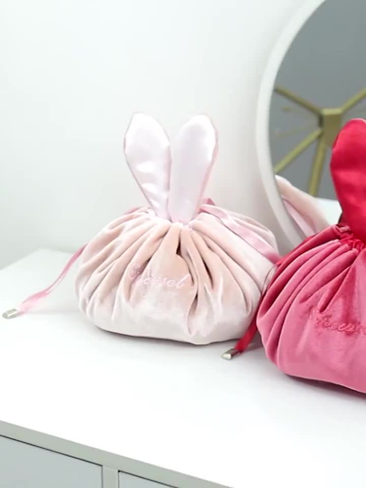 韩版懒人化妆包手拎兔耳朵丝绒化妆品收纳包旅行便携抽绳洗漱包