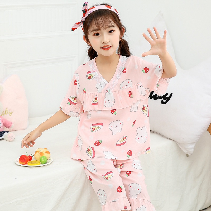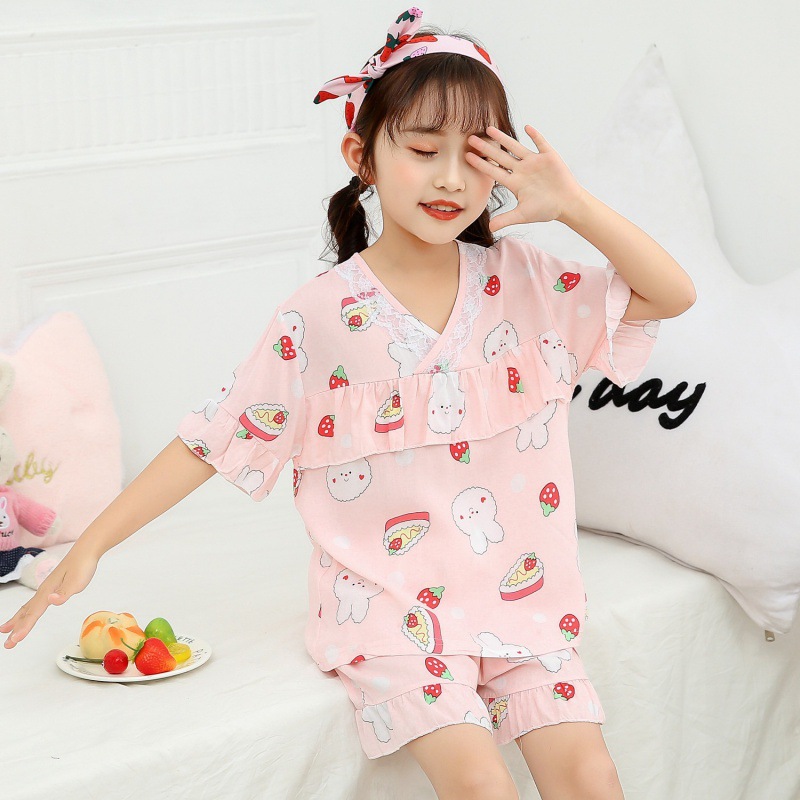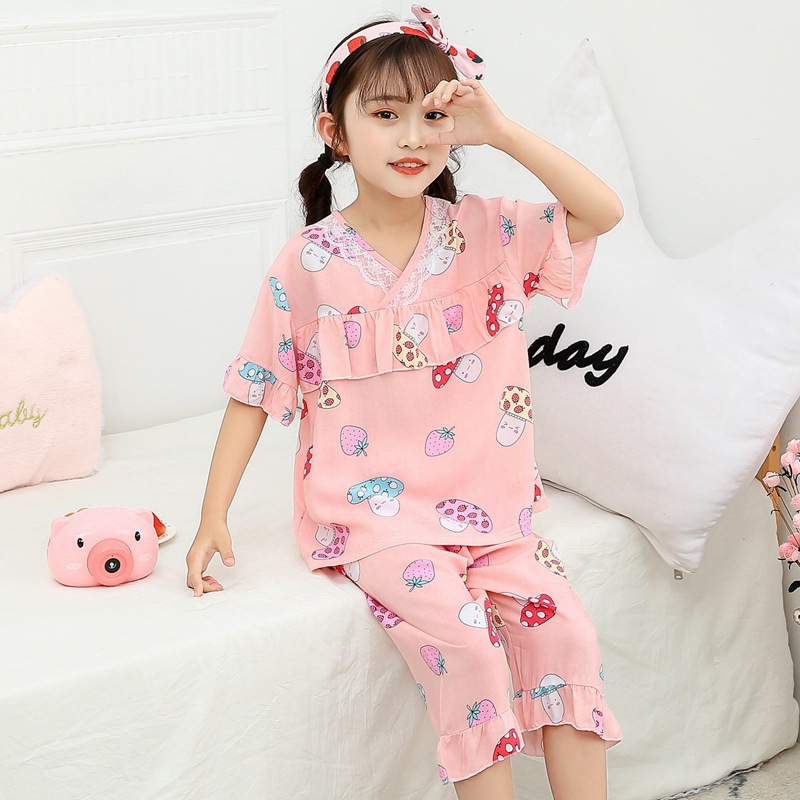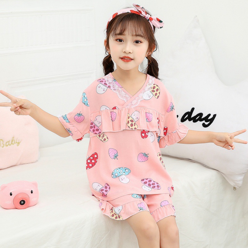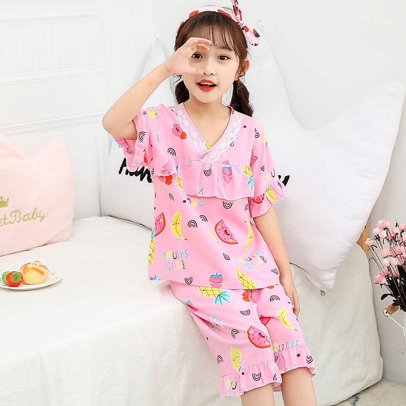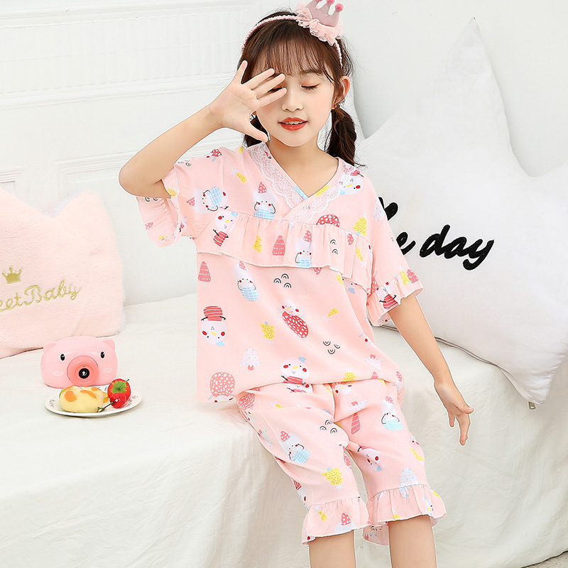 女童绵绸睡衣小女孩短袖短裤套装宝宝蕾丝花边宽松家居服两件套潮