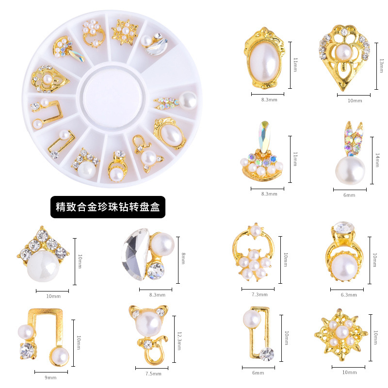 源头工厂美甲饰品12格钻盘日系珍珠合金指甲装饰百搭饰品跨境专供