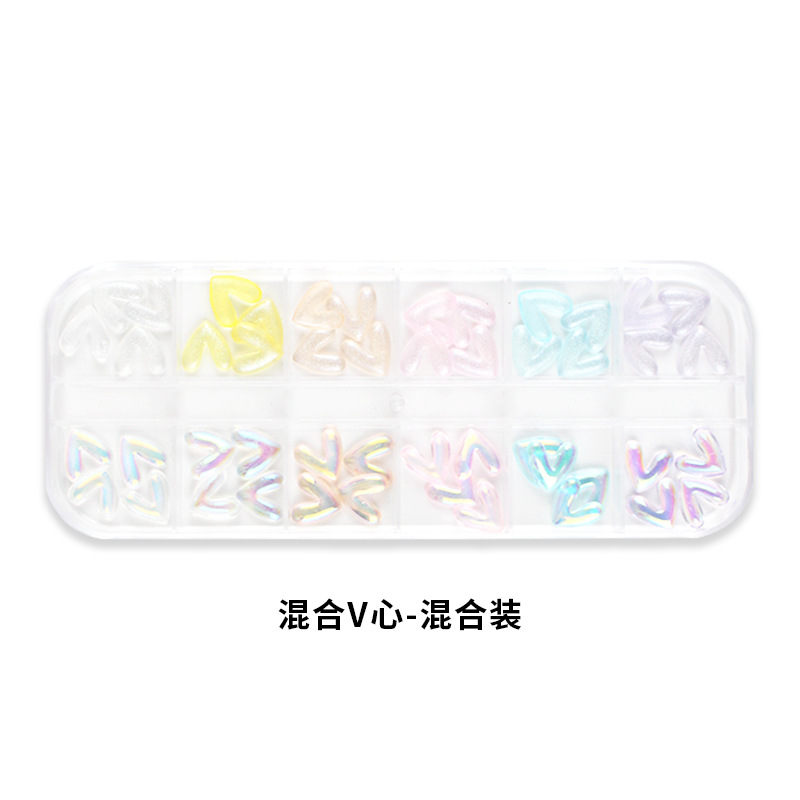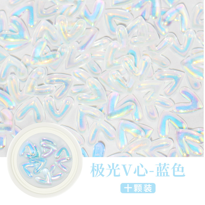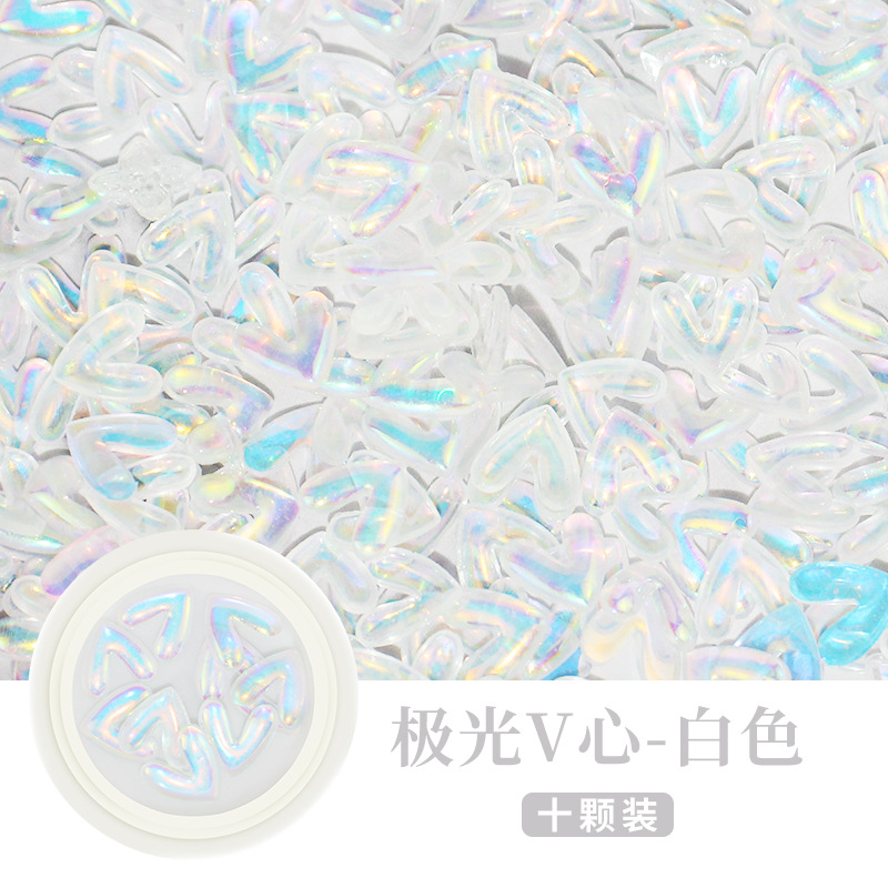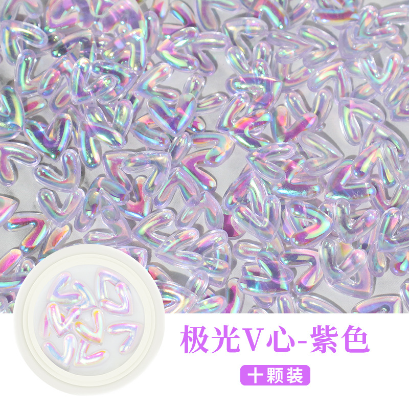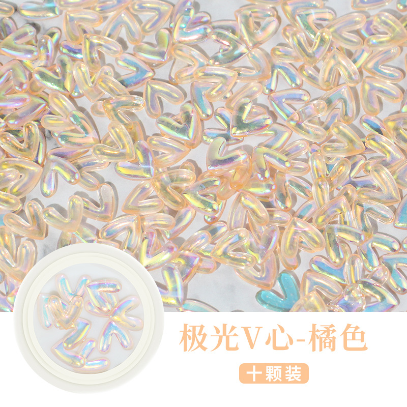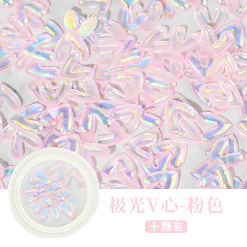 情人节心形饰品贴片V字形桃心树脂美甲饰品 极光幻彩爱心美甲贴钻