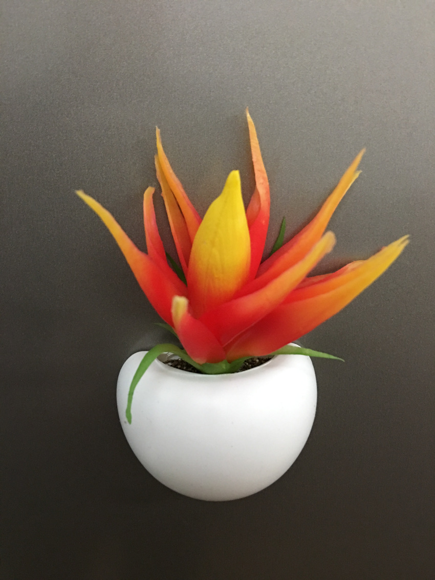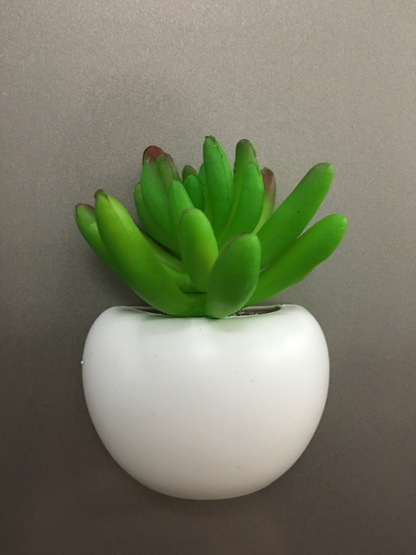特性:塑料花盆,内附磁铁,可以附着在含铁物质上(必须是含铁,铁物质不够会吸附不能),一般作为冰箱贴,墙壁装饰物。花盆上部花为多肉,硅胶材质。可水洗。