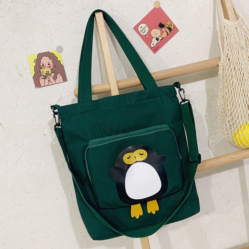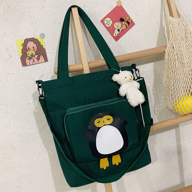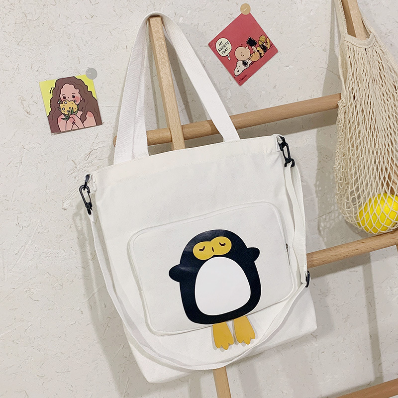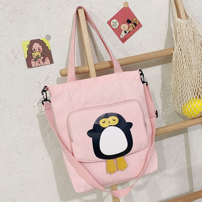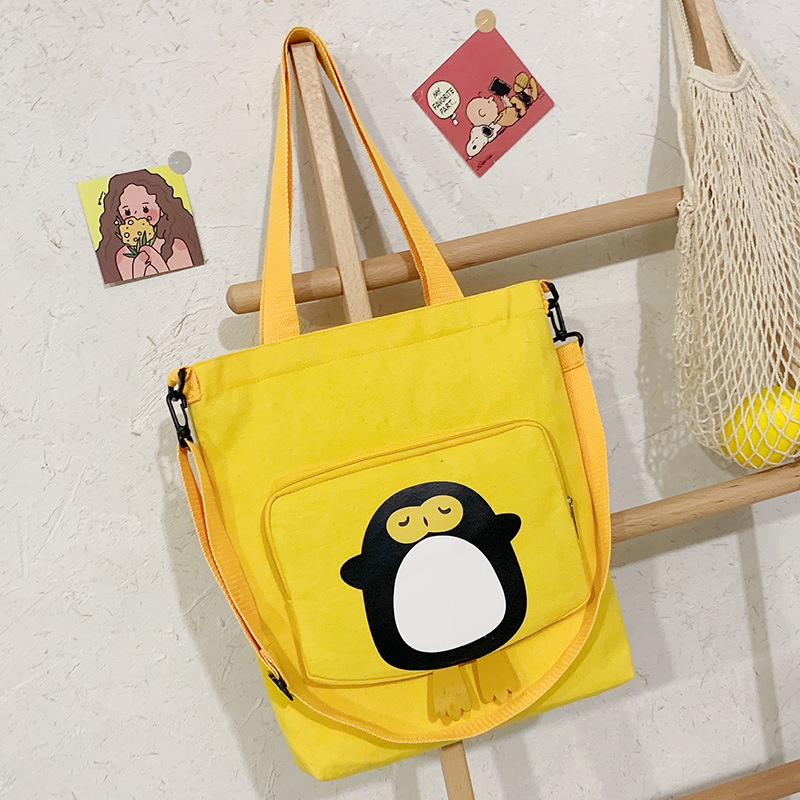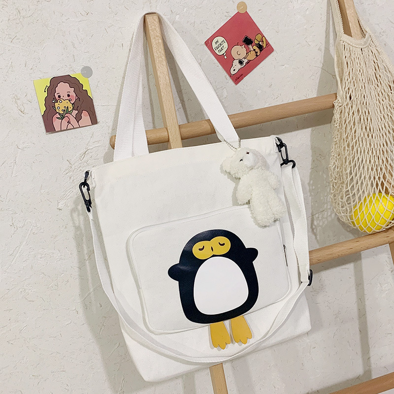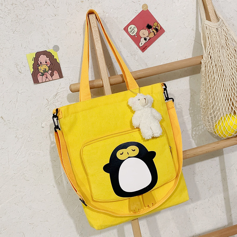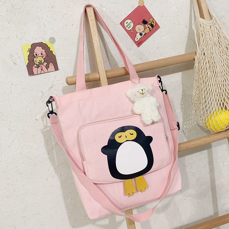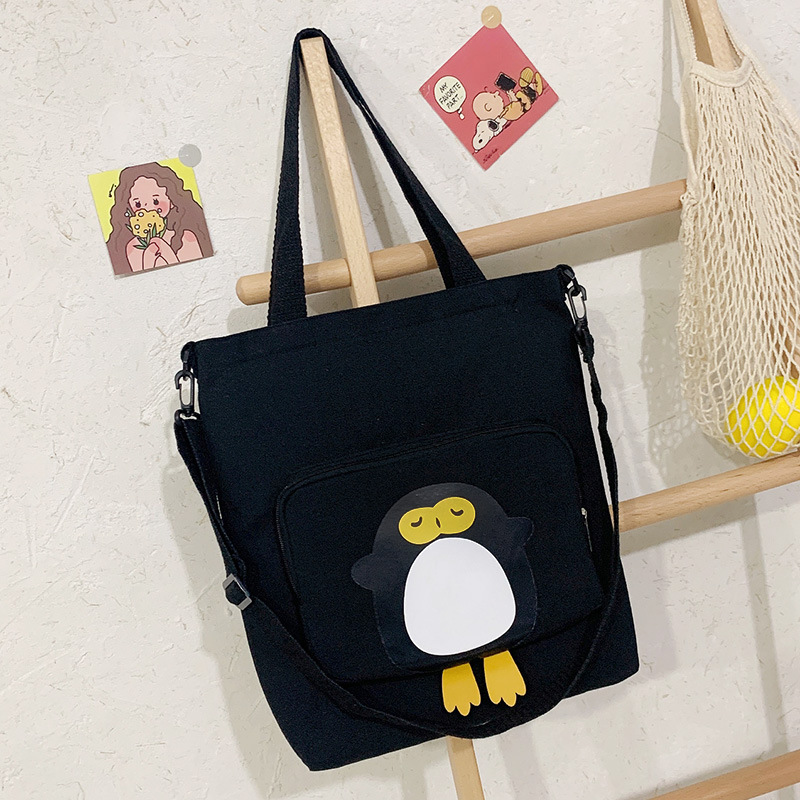 立体企鹅印花帆布包新款大容量帆布托特包学生补习袋可代发