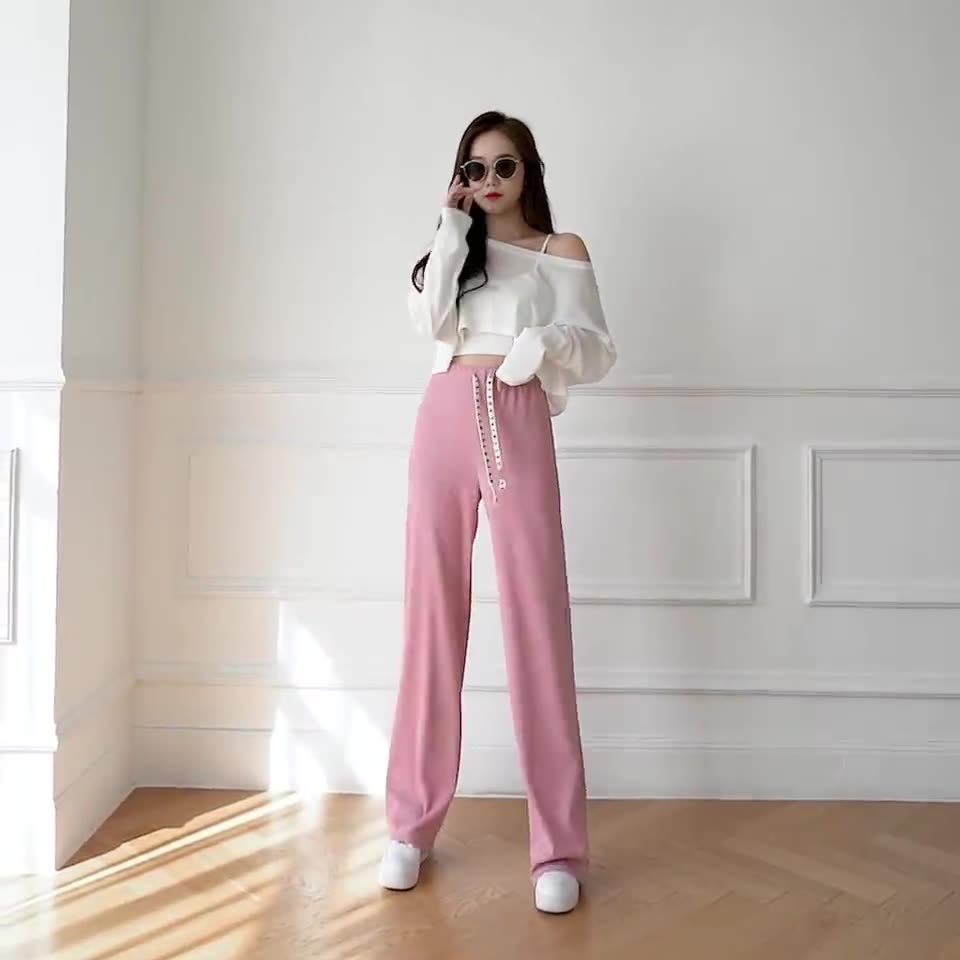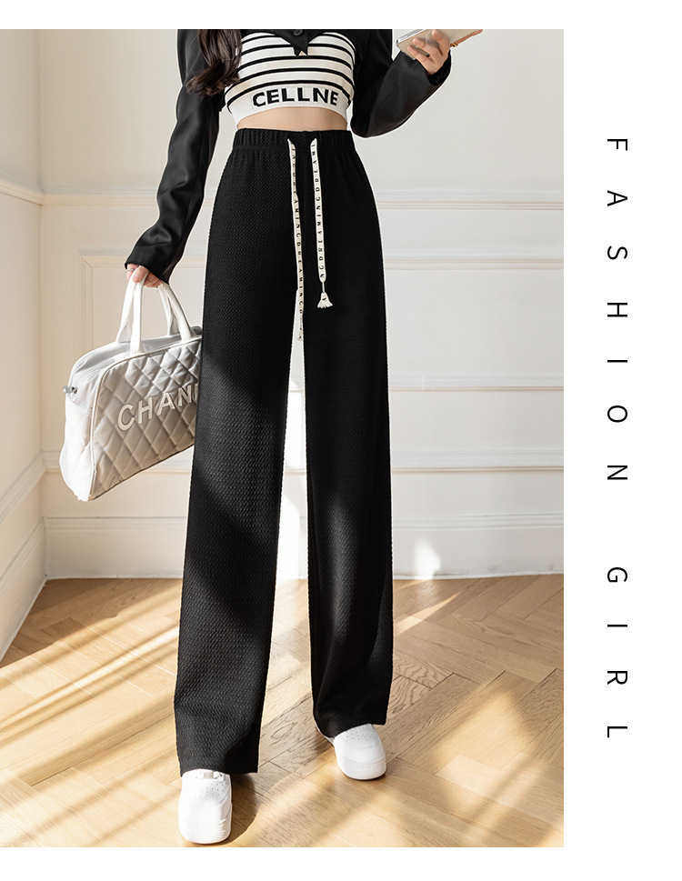 2022春新款高腰宽松垂感直筒拖地字母抽绳泡泡纹理小泡芙阔腿