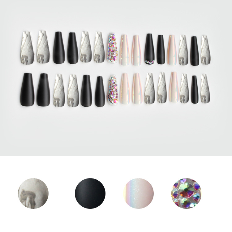 欧美热销超长芭蕾甲30片满钻假指甲磨砂黑白水纹指甲穿戴甲美甲