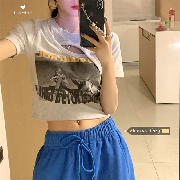 东南亚女装2022夏季假两件短袖T恤女学生短款露脐印花上衣潮