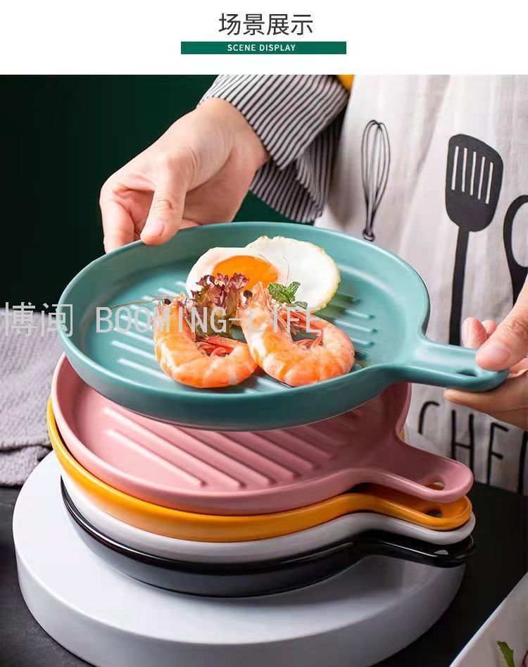 外贸9寸圆形横纹手柄烤盘 厨房网红陶瓷碗盘杯碟烤盘