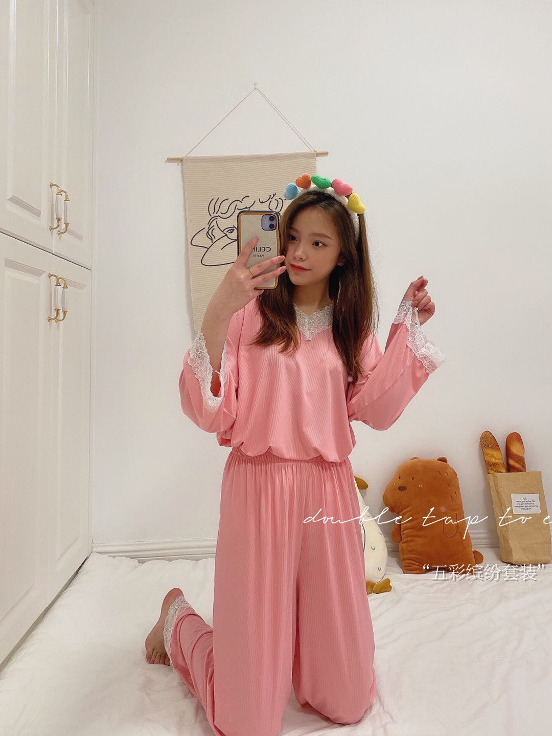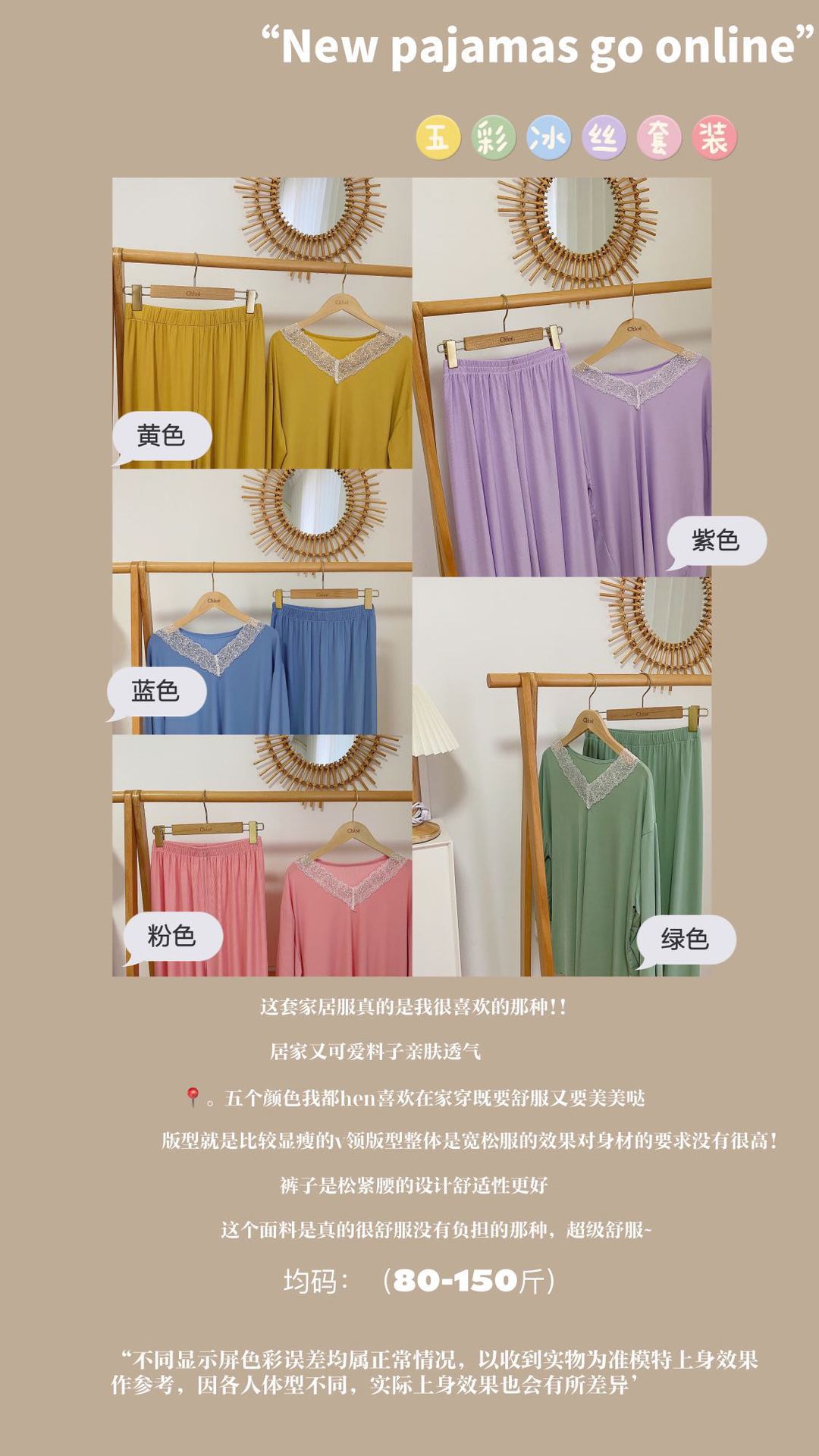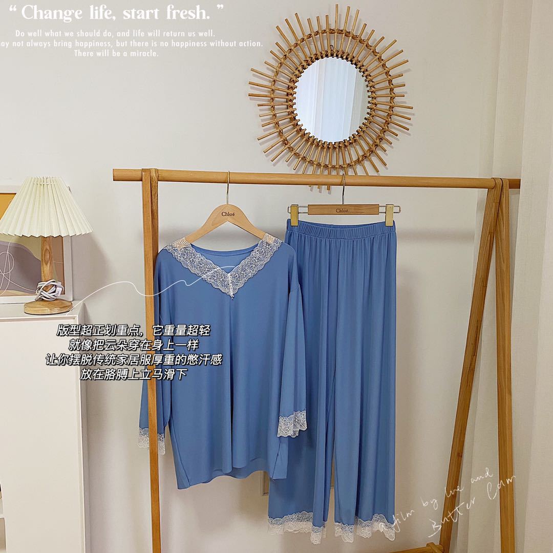 睡衣女夏季冰丝长袖长裤宽松大码家居服轻柔两件套V领蕾丝绣