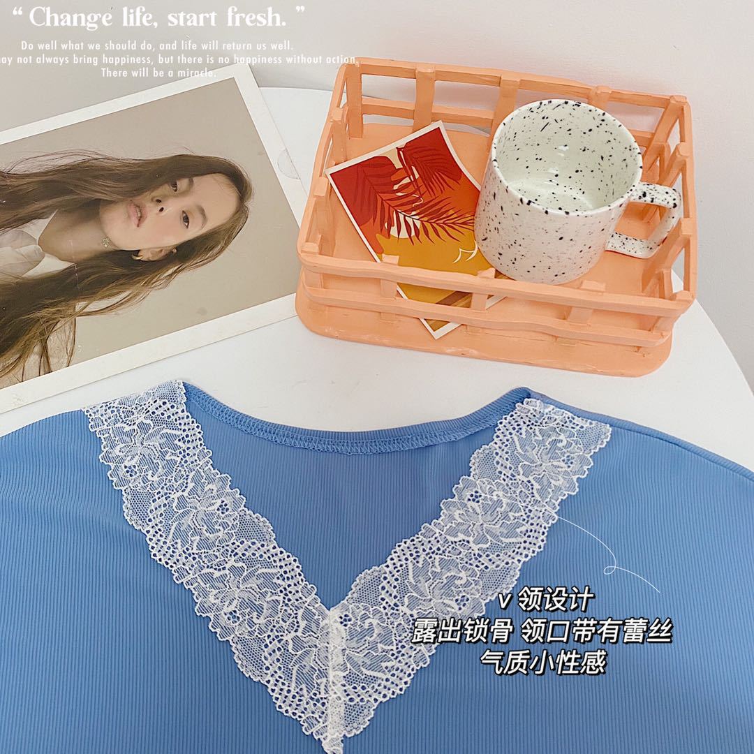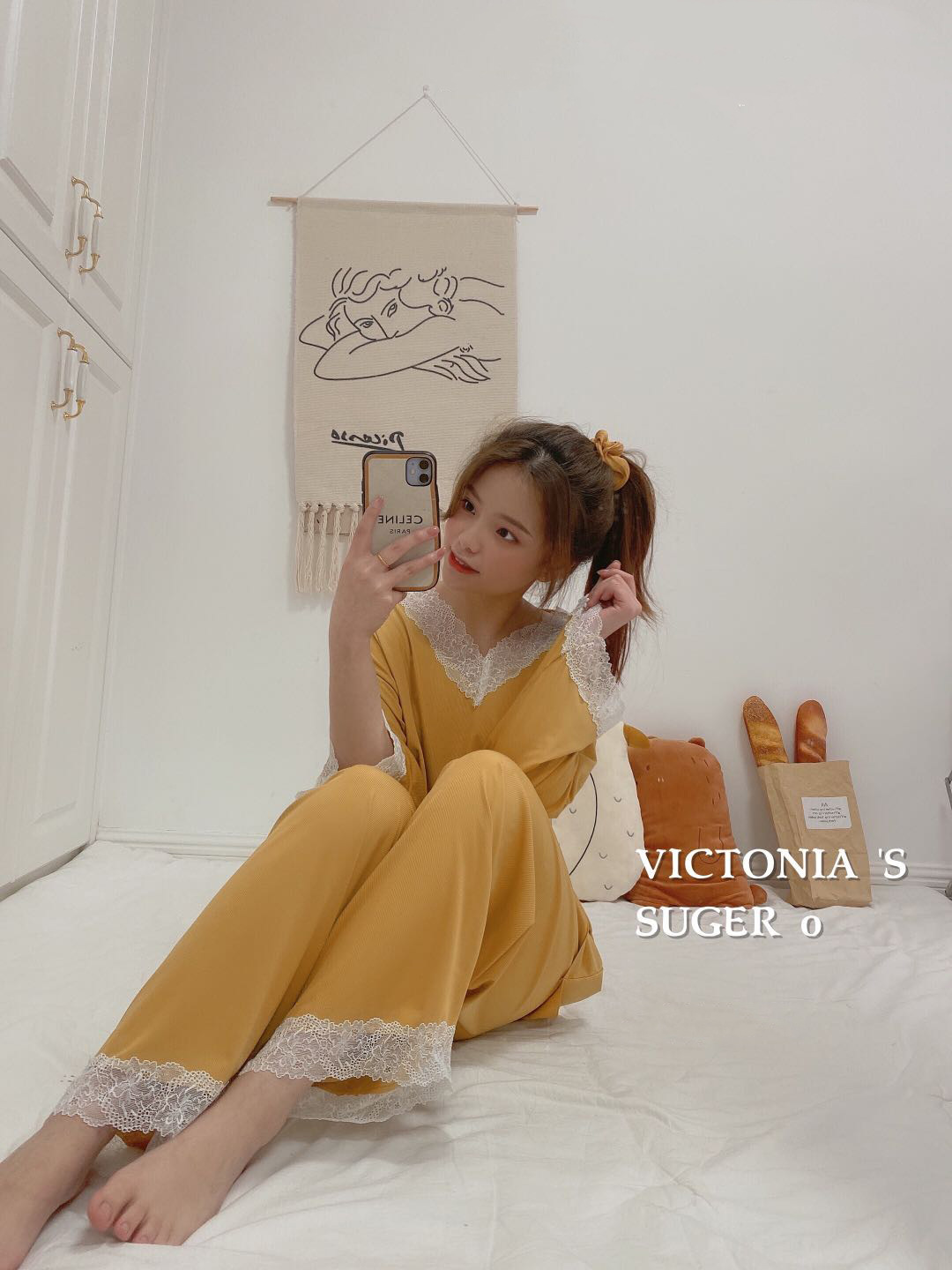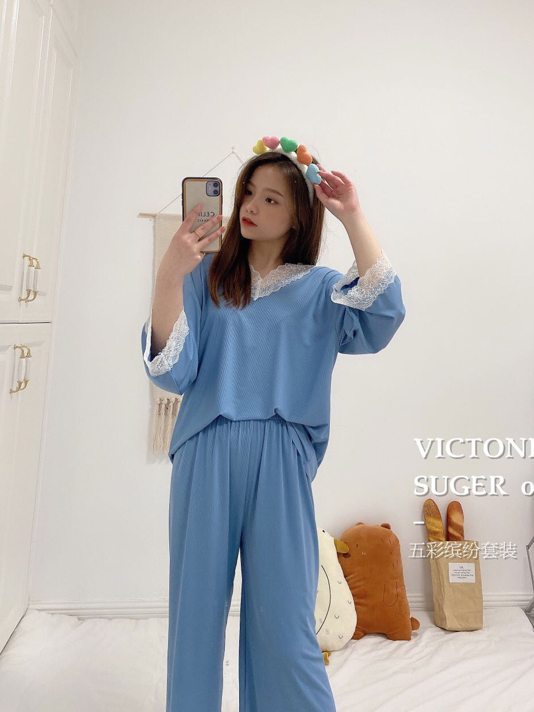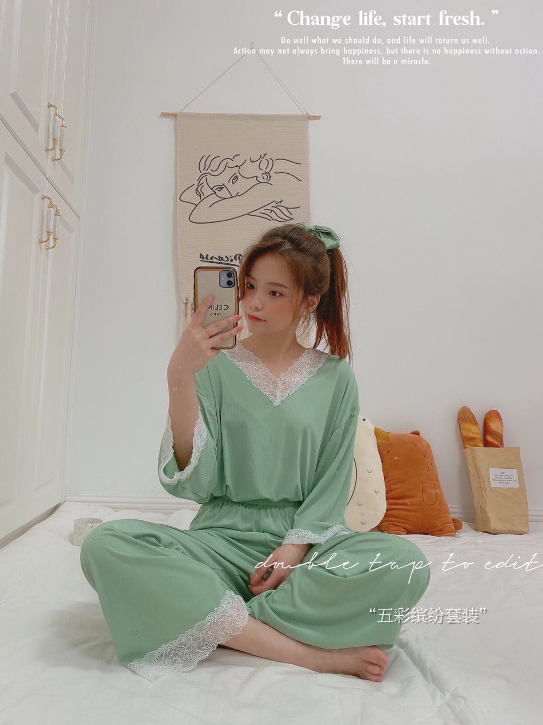 睡衣女夏季冰丝长袖长裤宽松大码家居服轻柔两件套V领蕾丝绣
