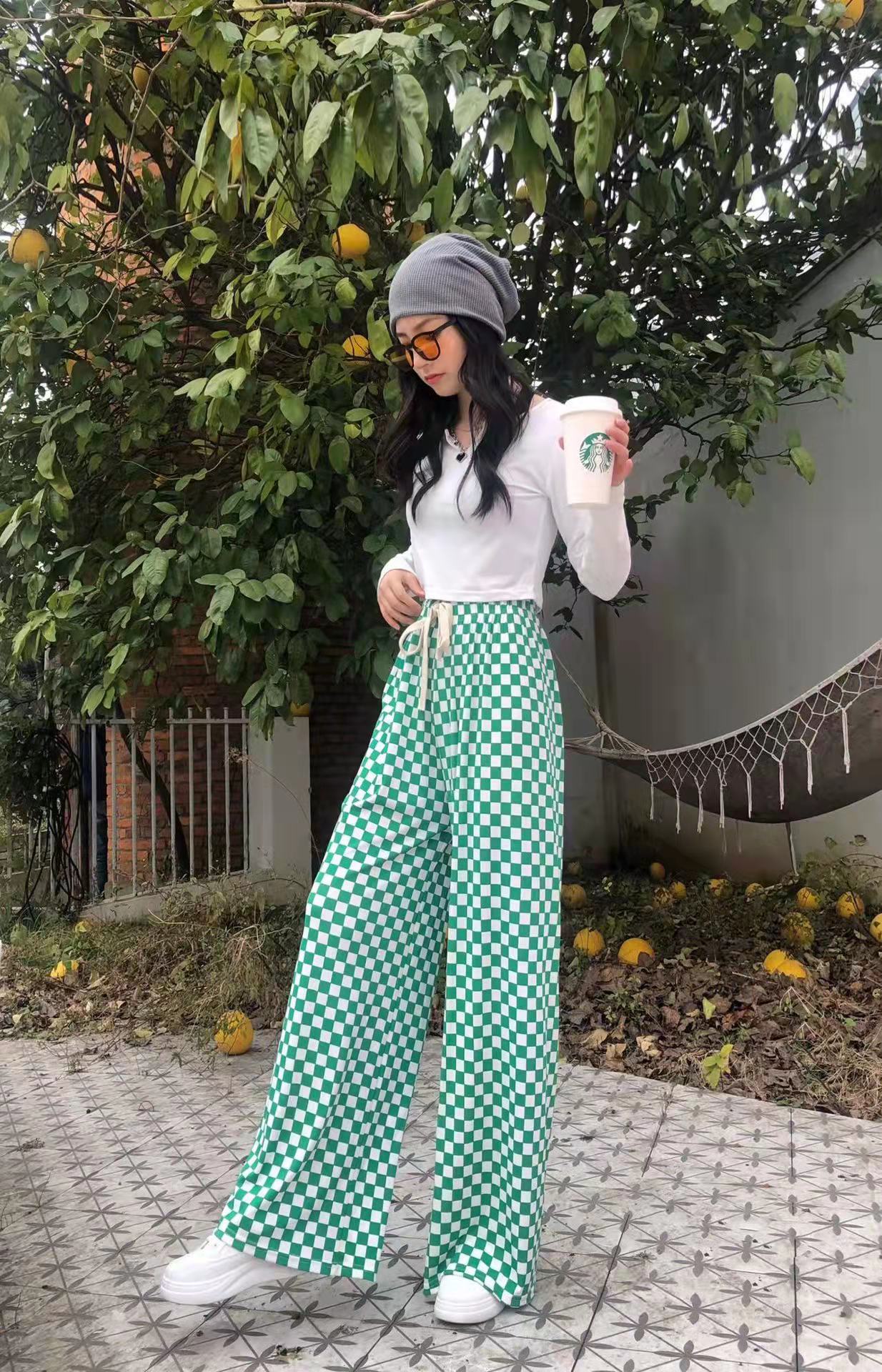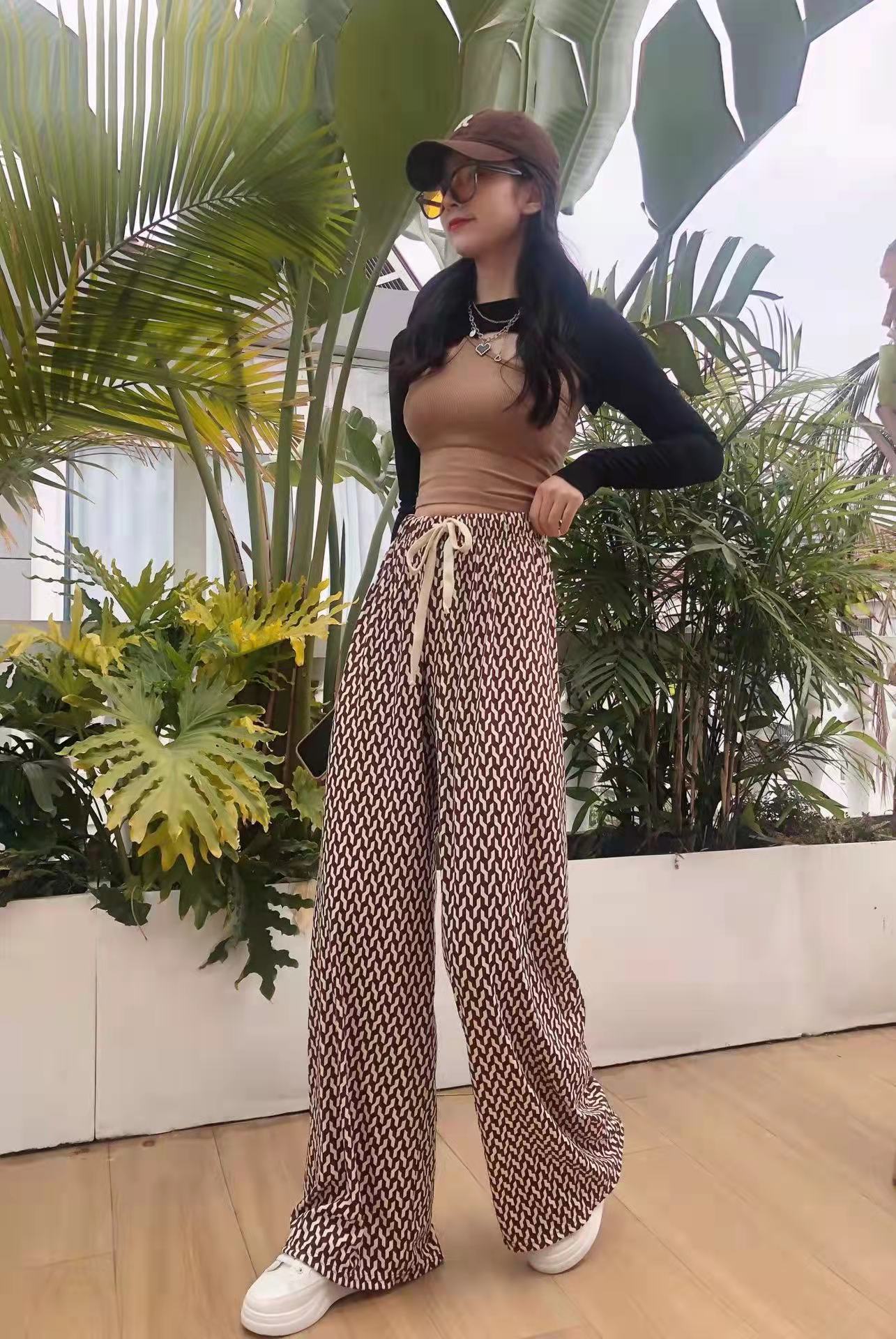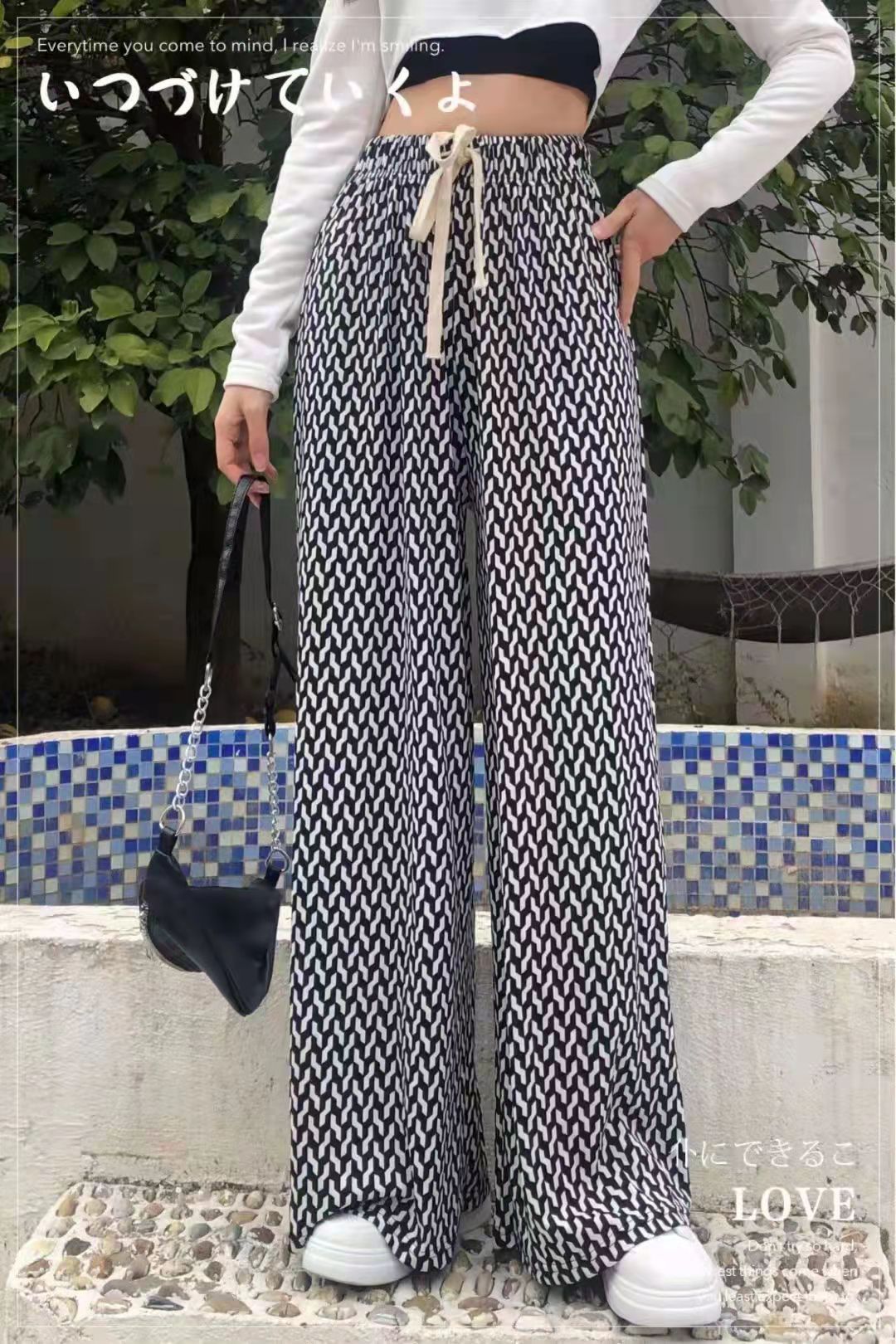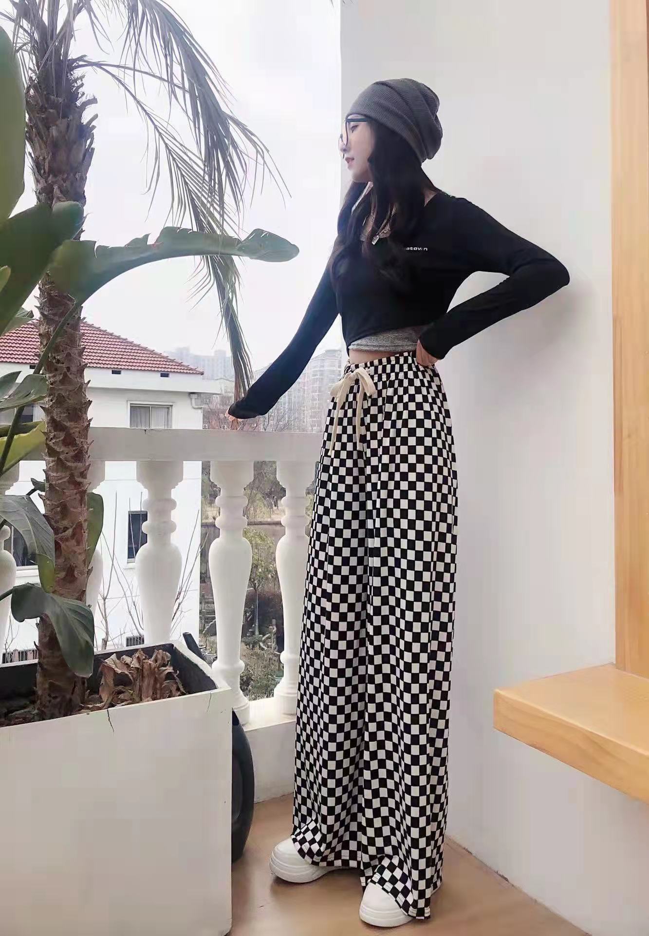 棋盘格冰丝阔腿裤女春夏2022年高腰垂感小个子休闲拖地格子直