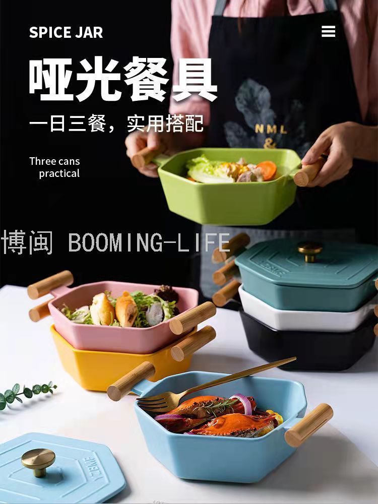 夏天双耳木柄碗 厨房网红陶瓷碗盘杯碟烤盘