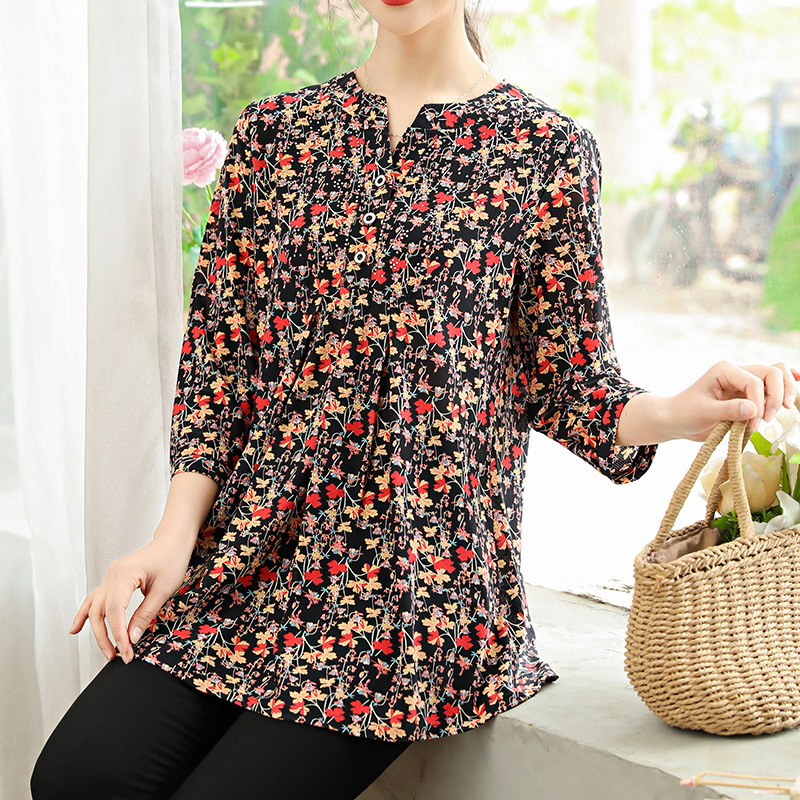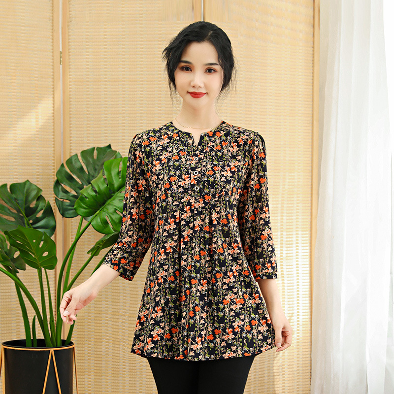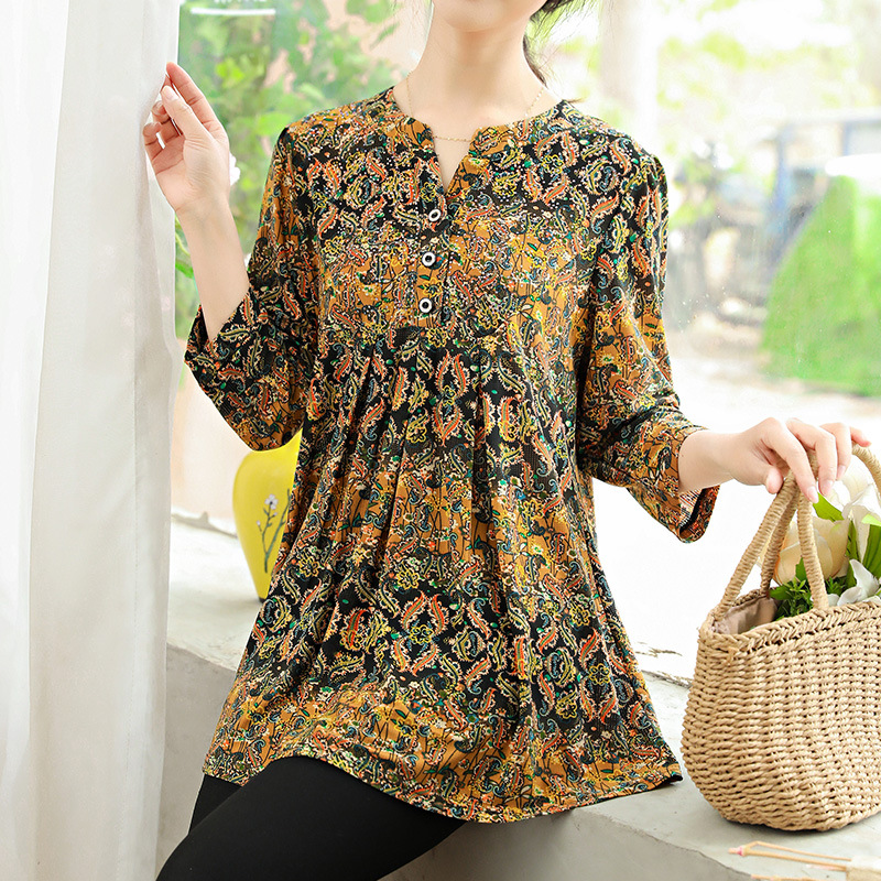 中老年女装春夏中袖T恤妈妈装加肥加大码七分袖宽松印花上衣