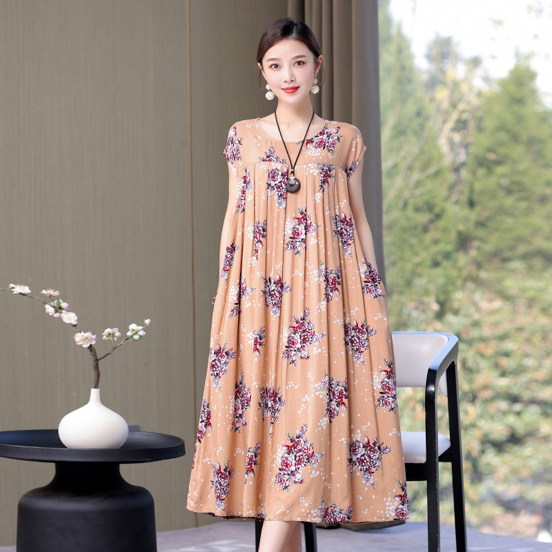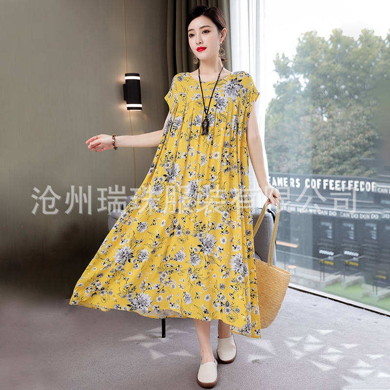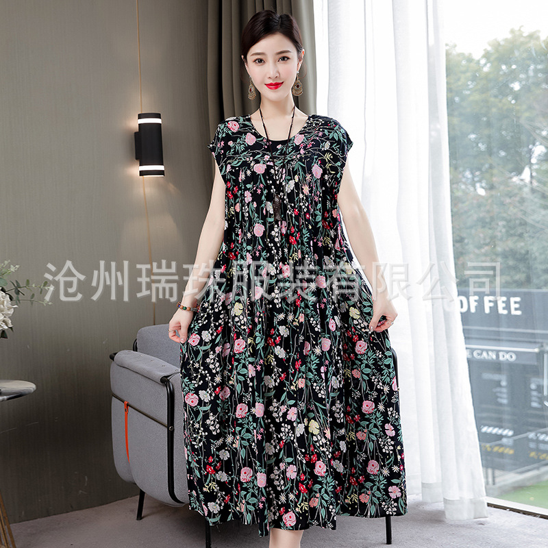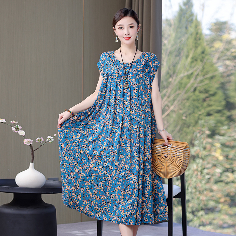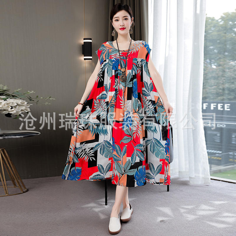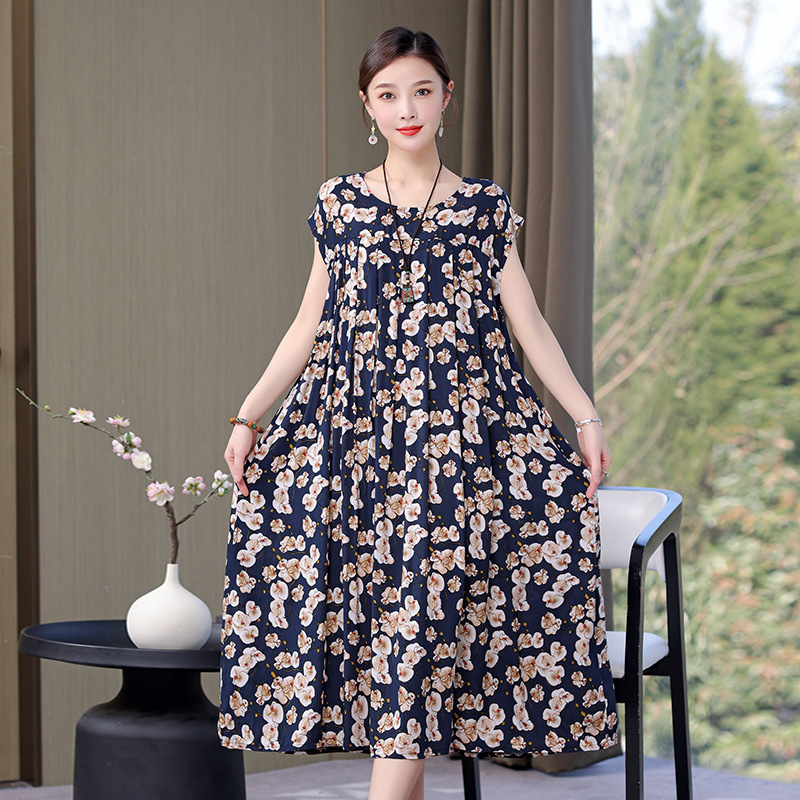妈妈夏装棉绸连衣裙新款宽松大码中年洋气过膝长裙子200斤可穿