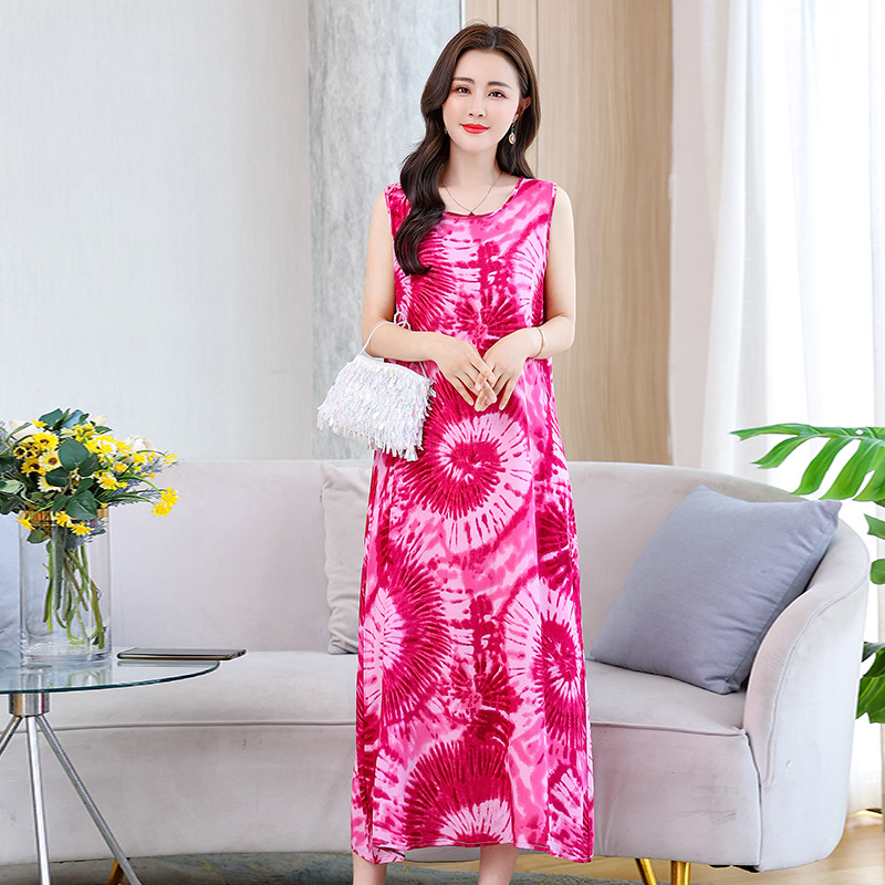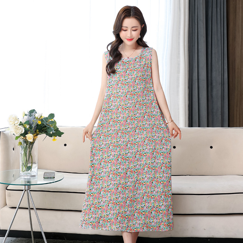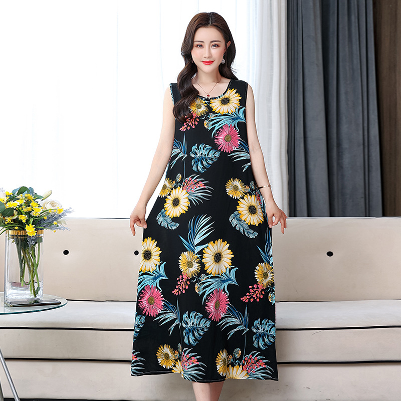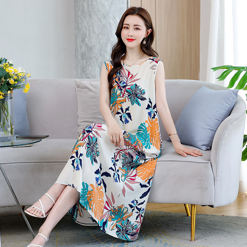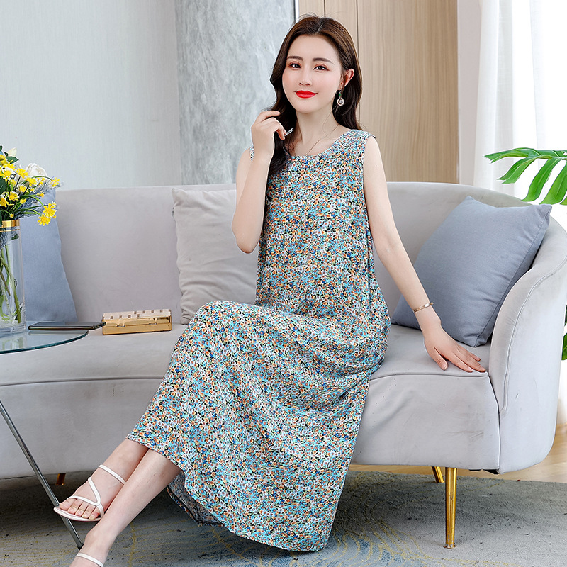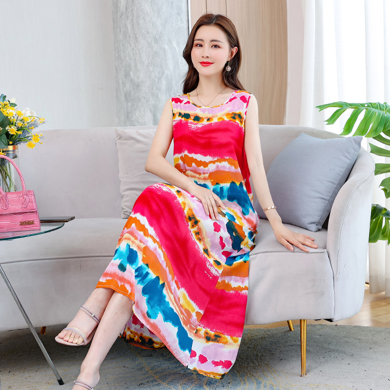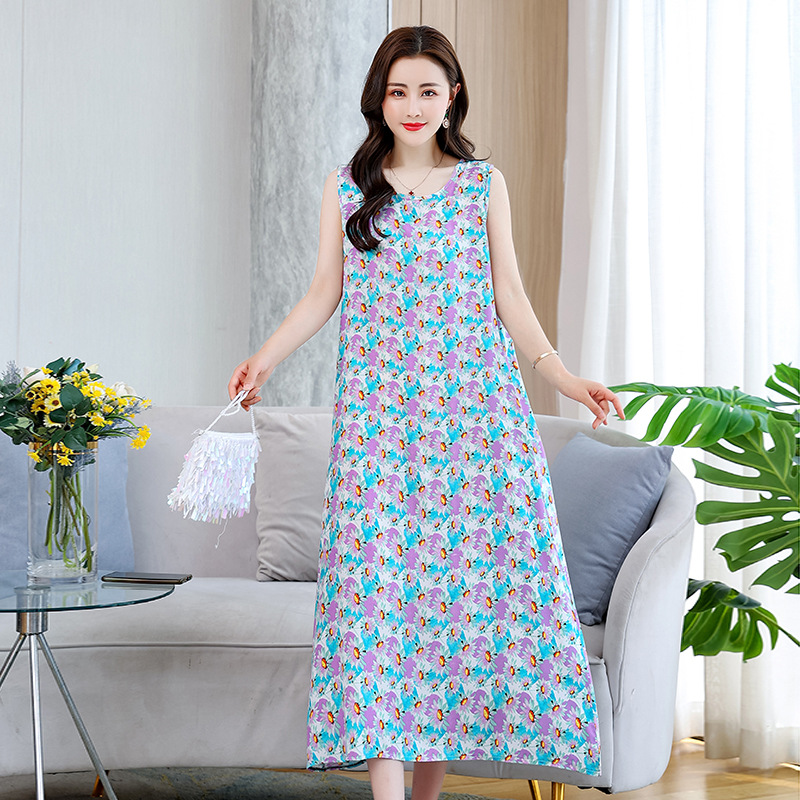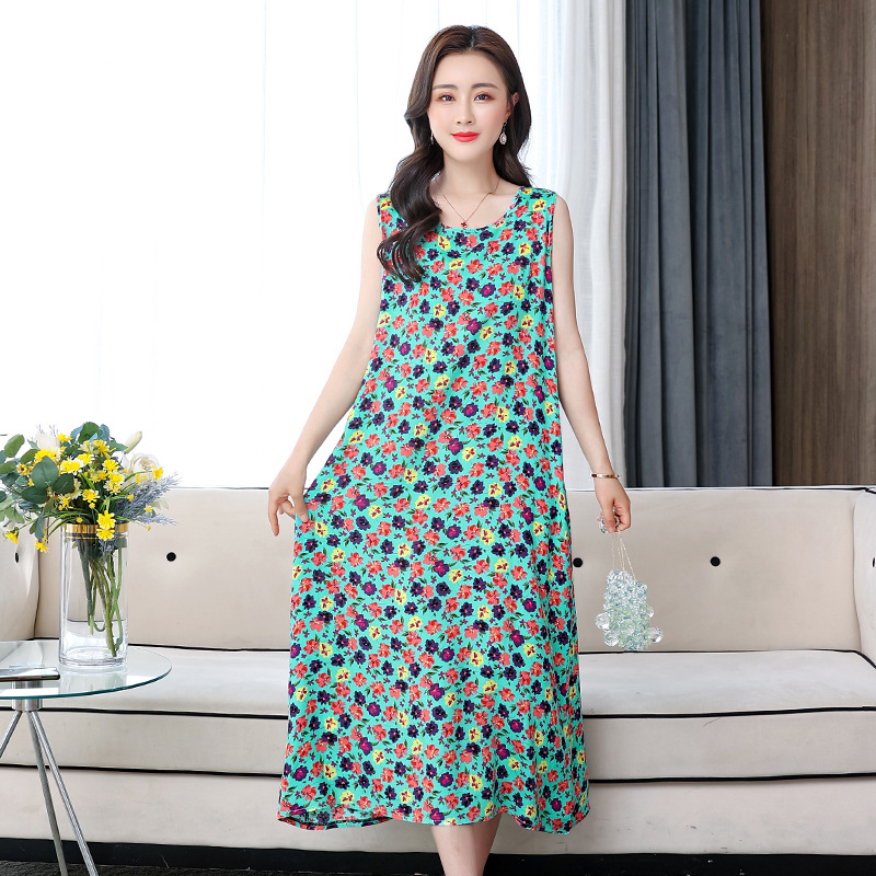 新款棉绸连衣裙夏季妈妈大码宽松过膝长裙时尚印花长裙子