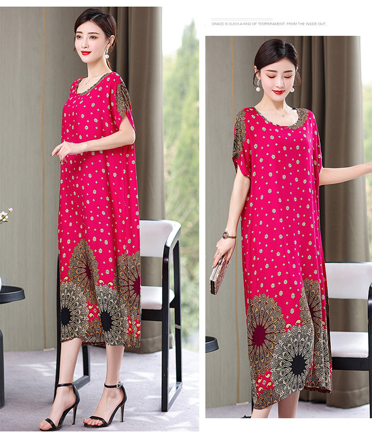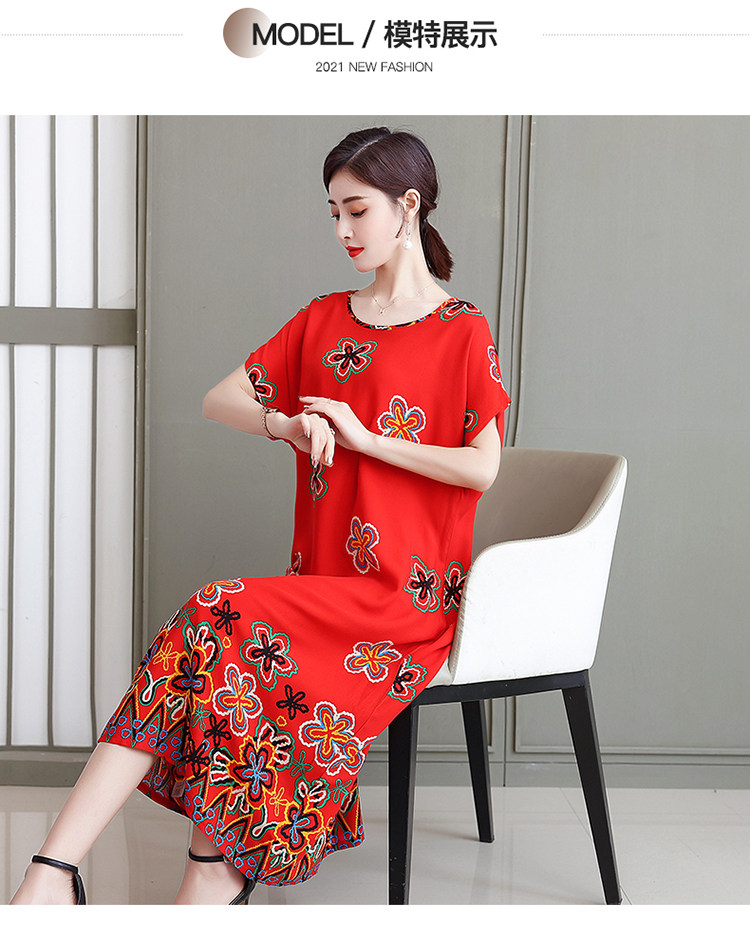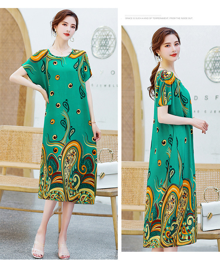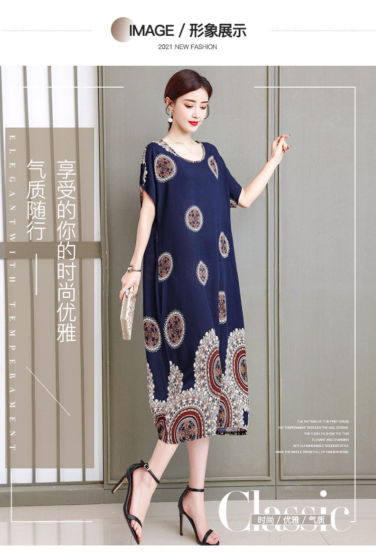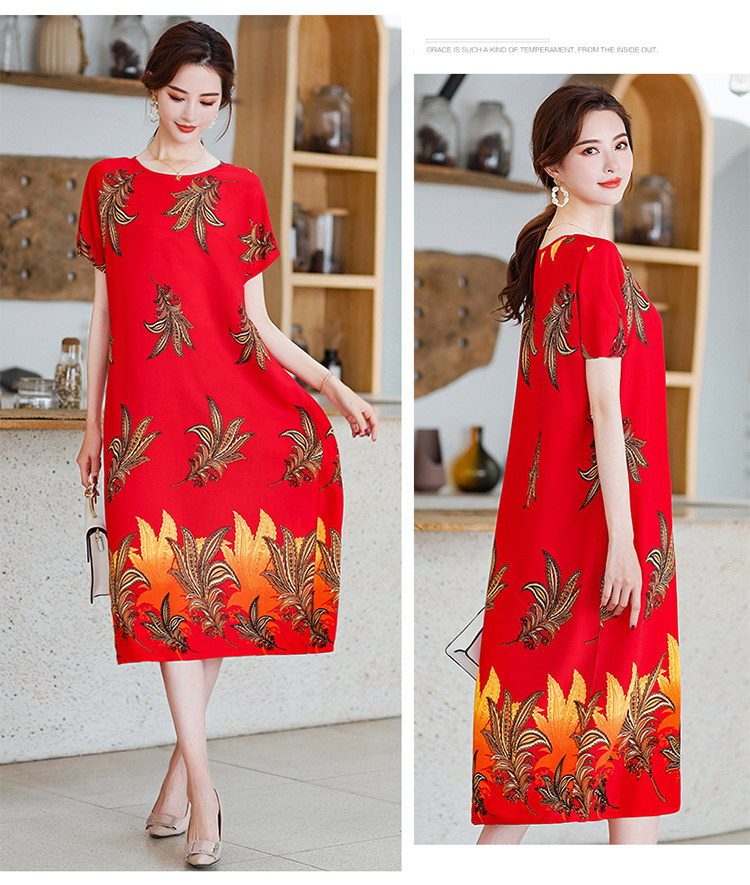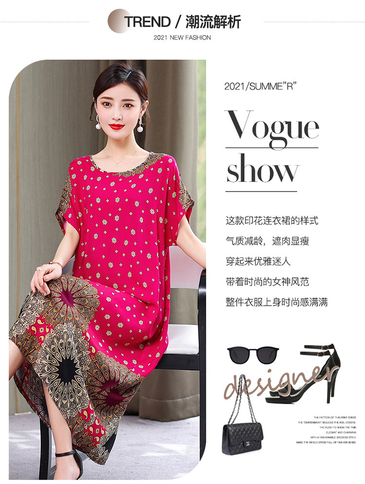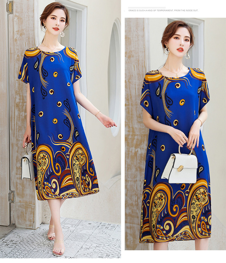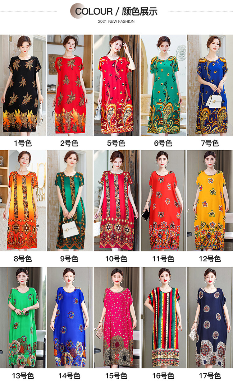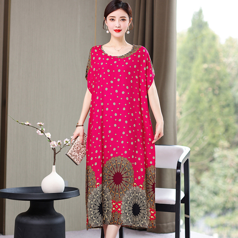 夏季新款中老年棉绸裙子女装印花连衣裙时尚妈妈装大码短袖长裙