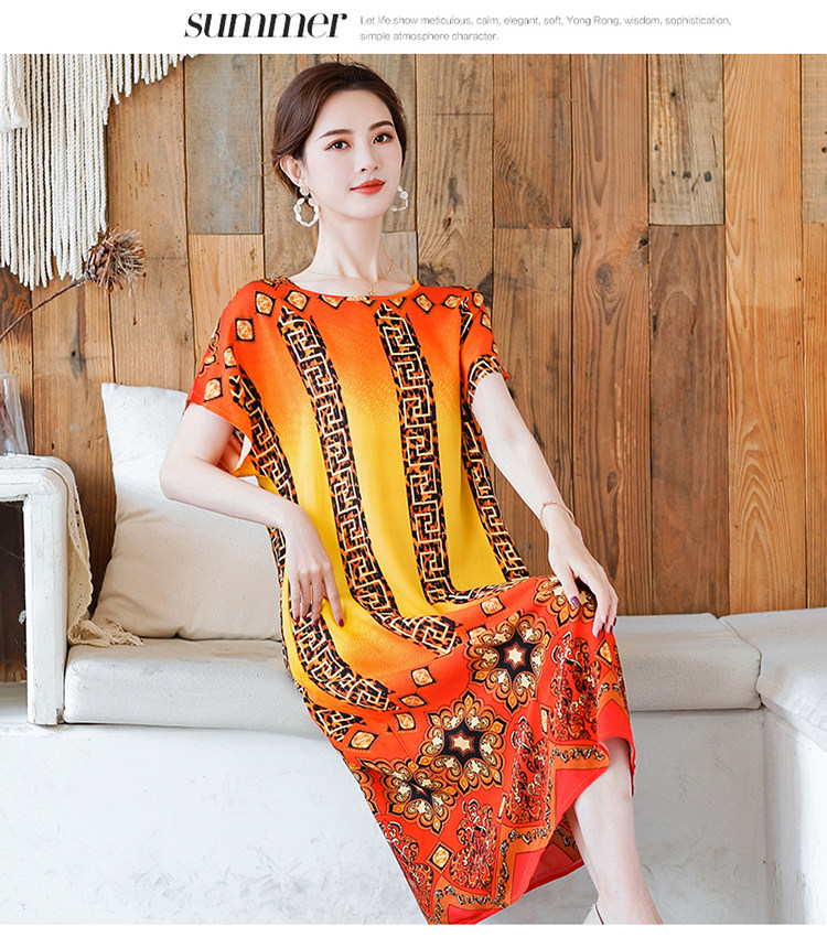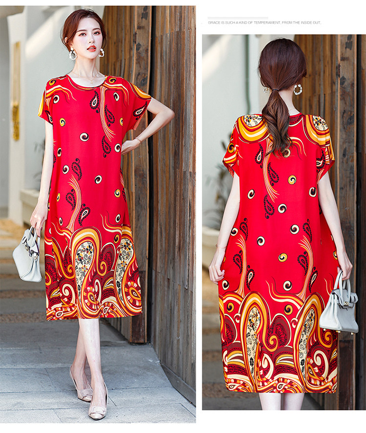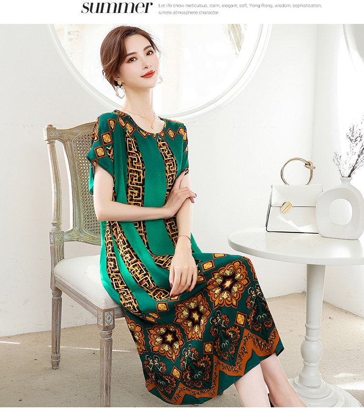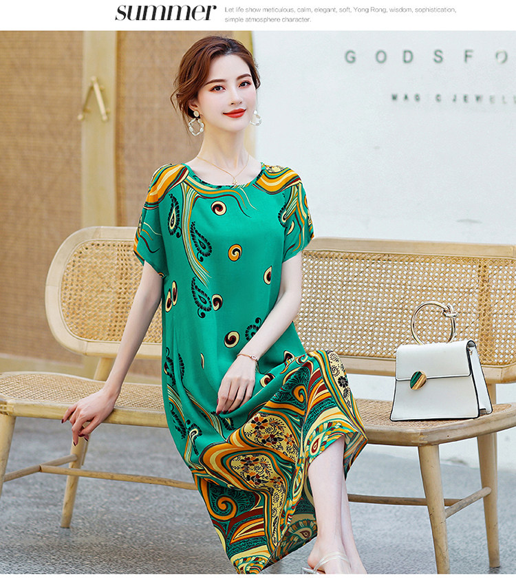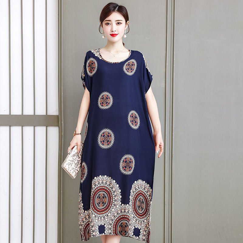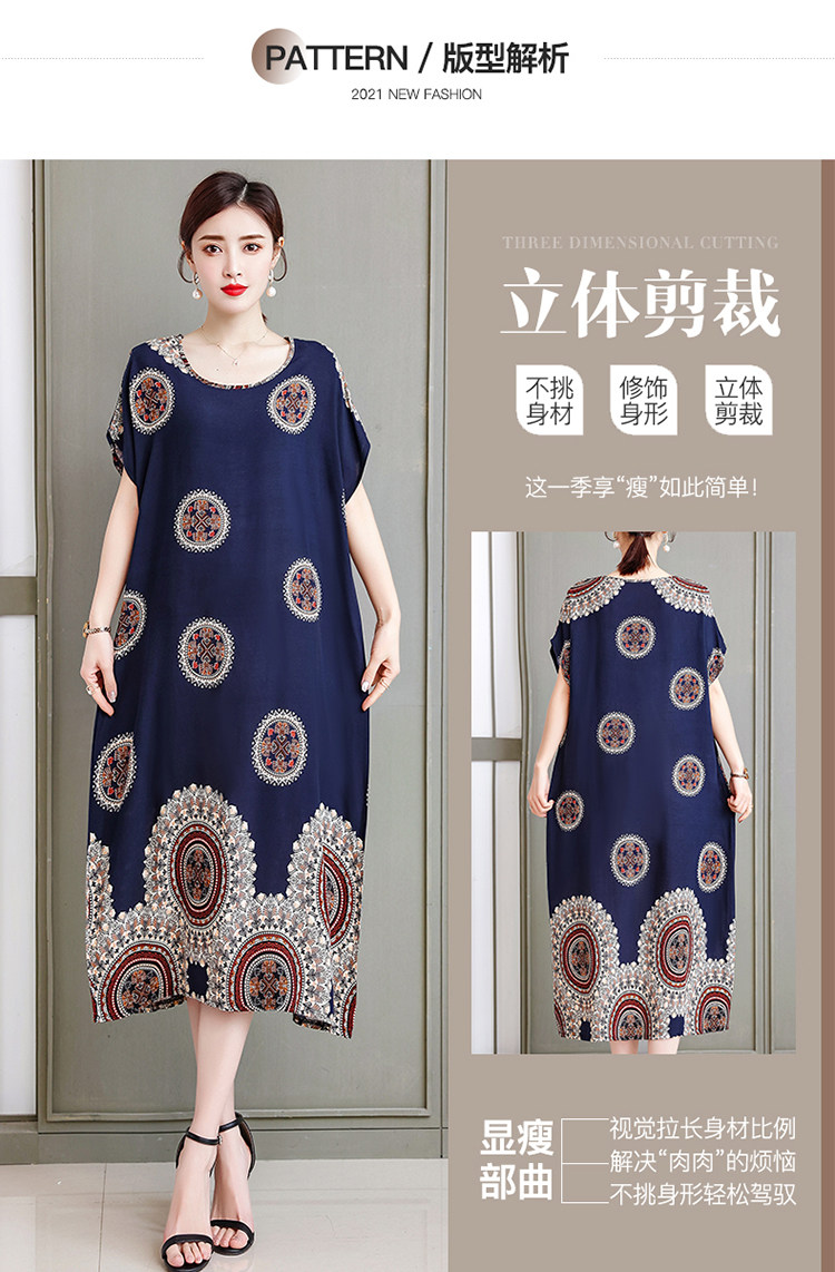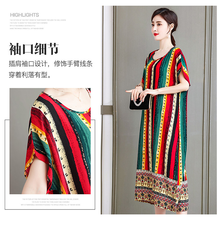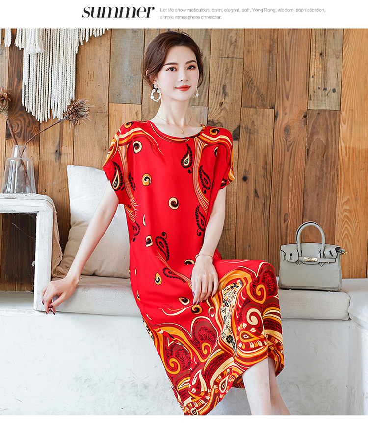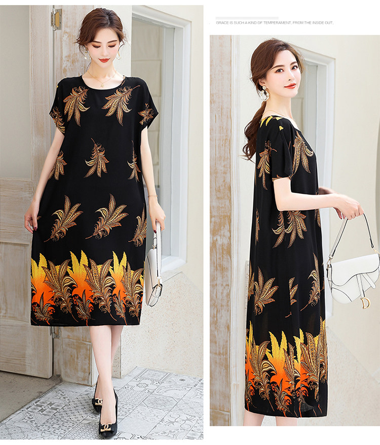 夏季新款中老年棉绸裙子女装印花连衣裙时尚妈妈装大码短袖长裙