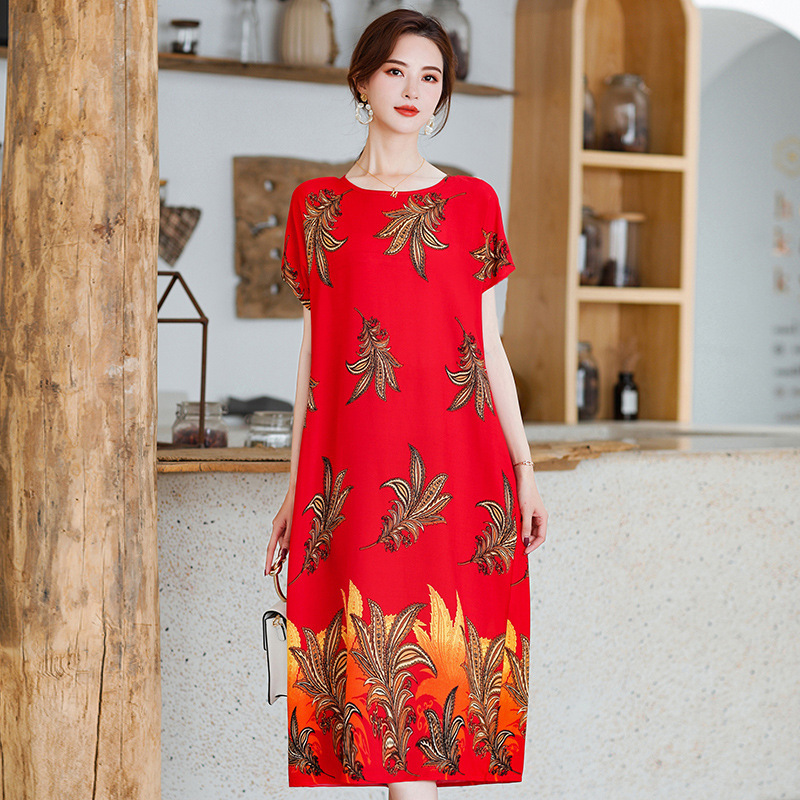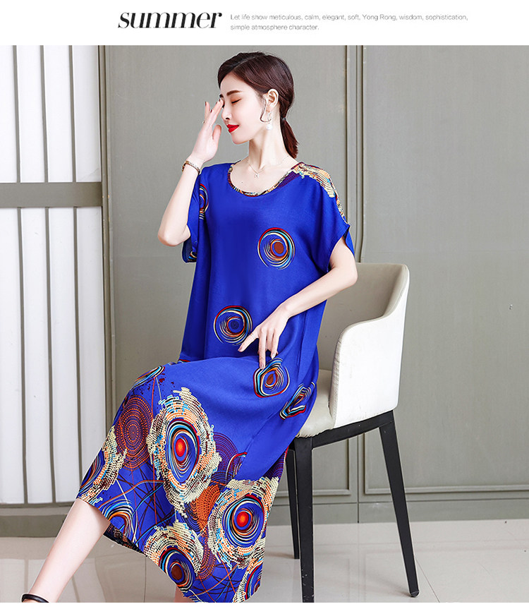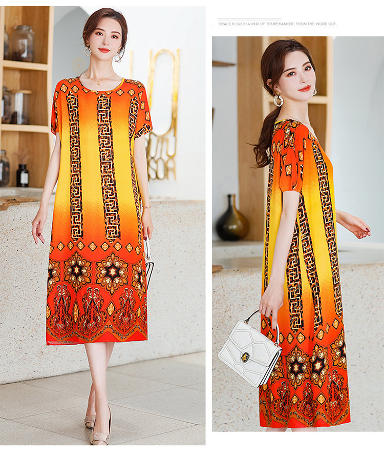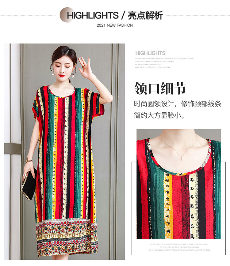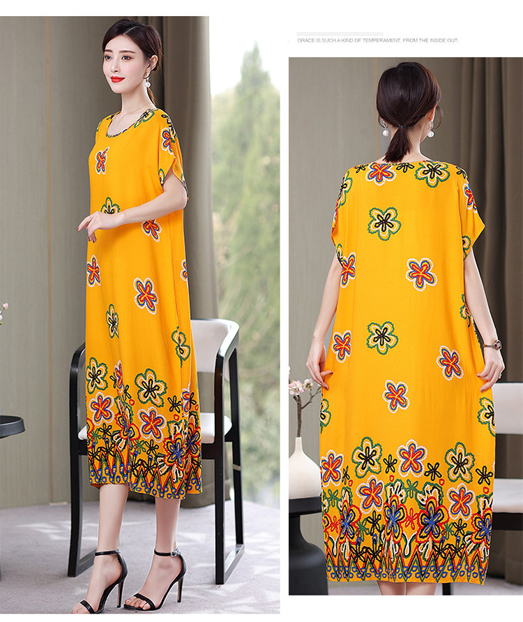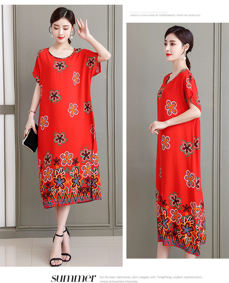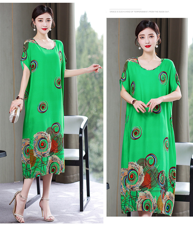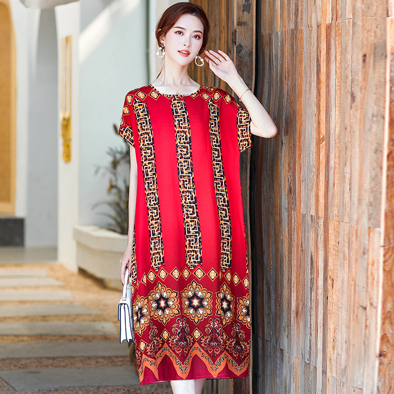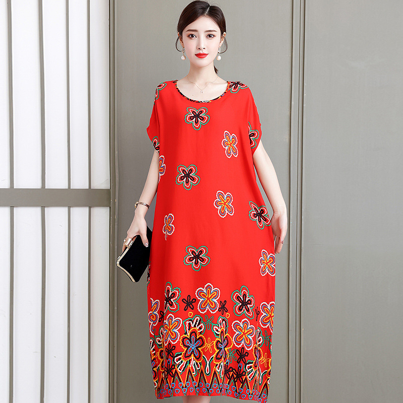 夏季新款中老年棉绸裙子女装印花连衣裙时尚妈妈装大码短袖长裙