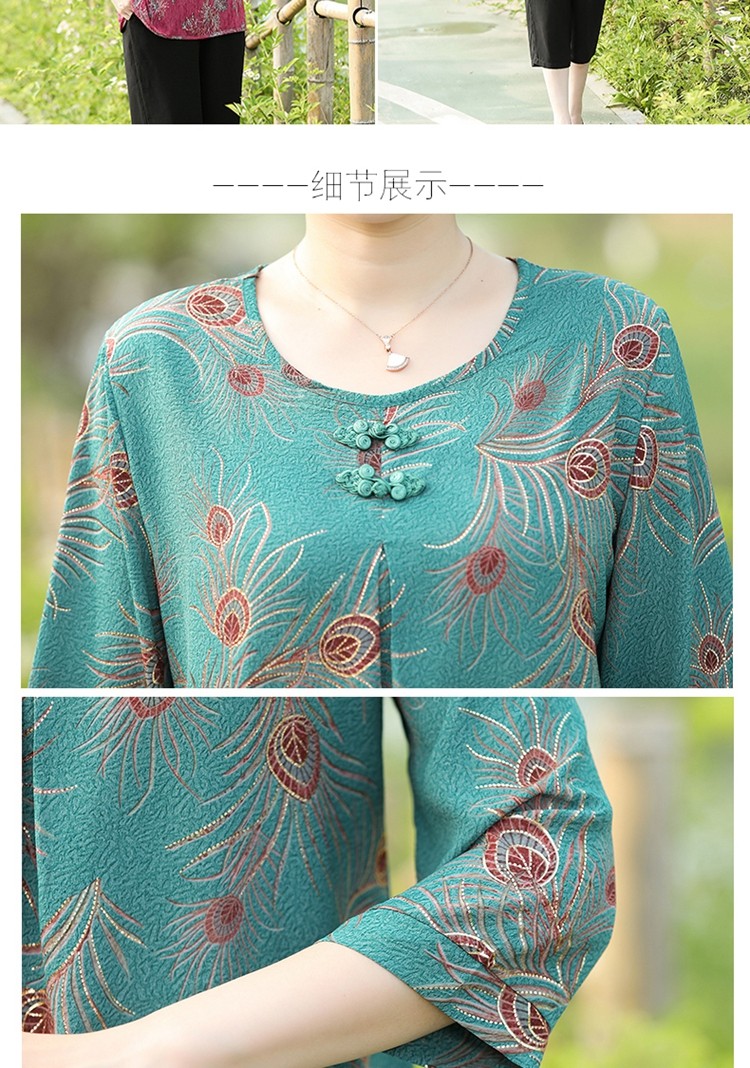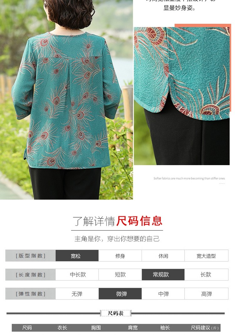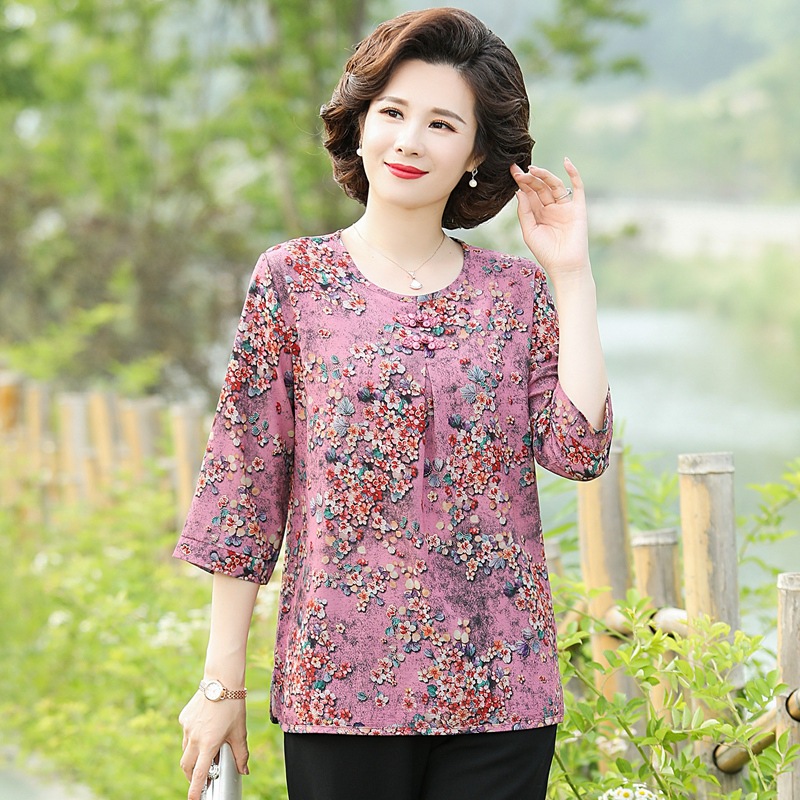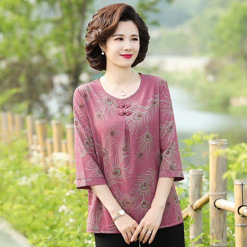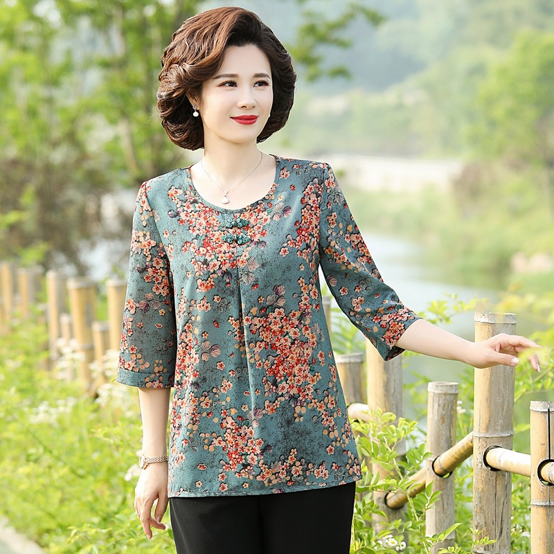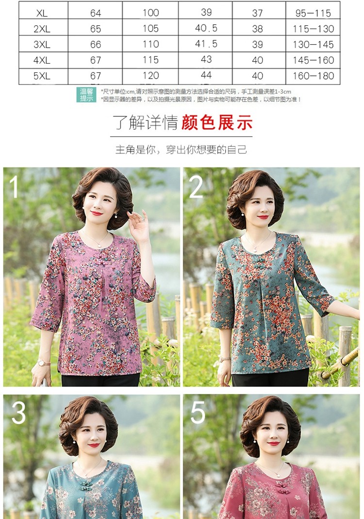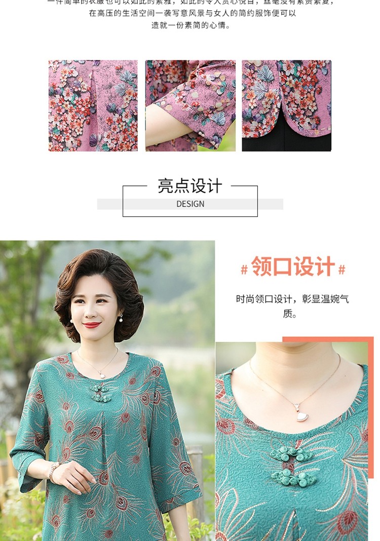 妈妈夏装新款T恤七分袖印花上衣中老年女装宽松大码打底衫薄款