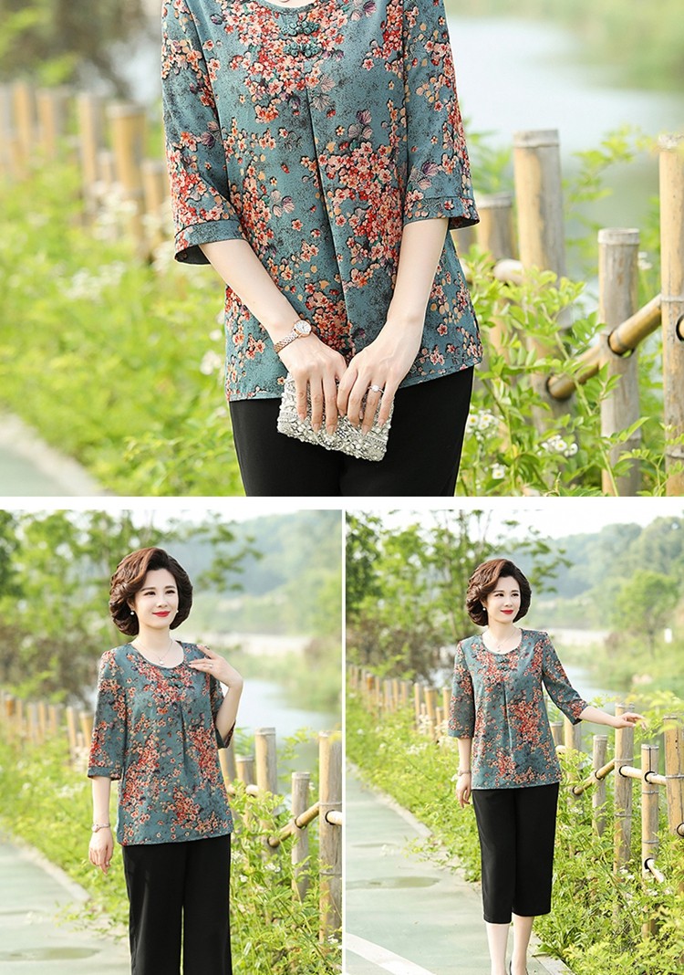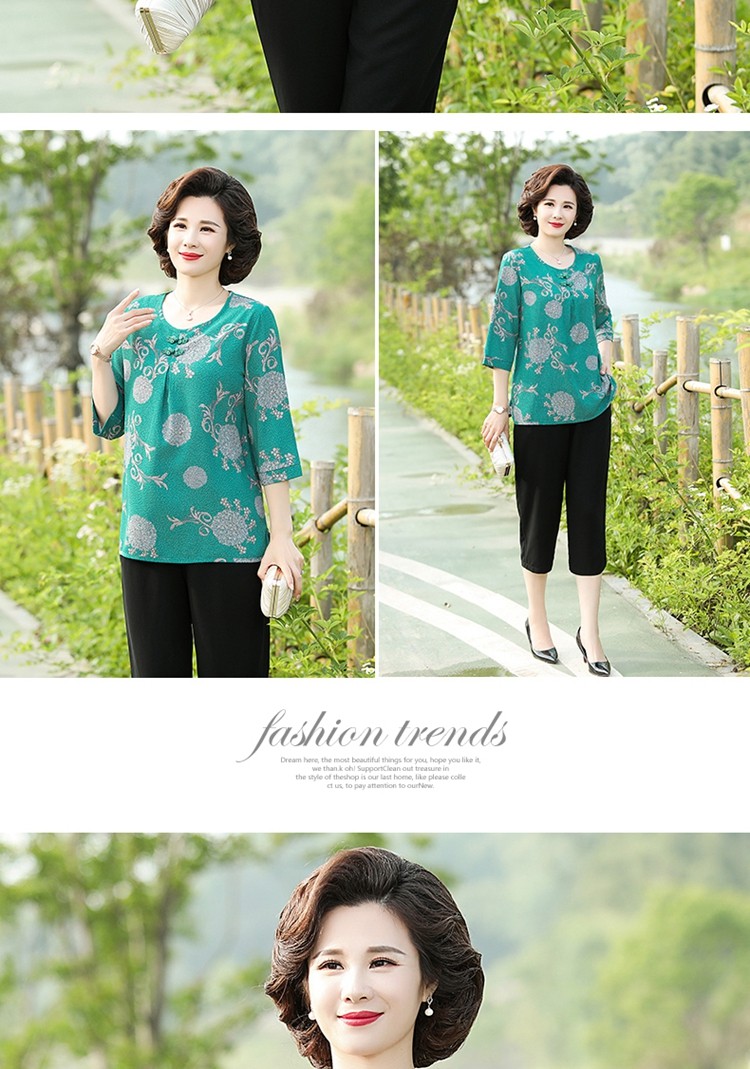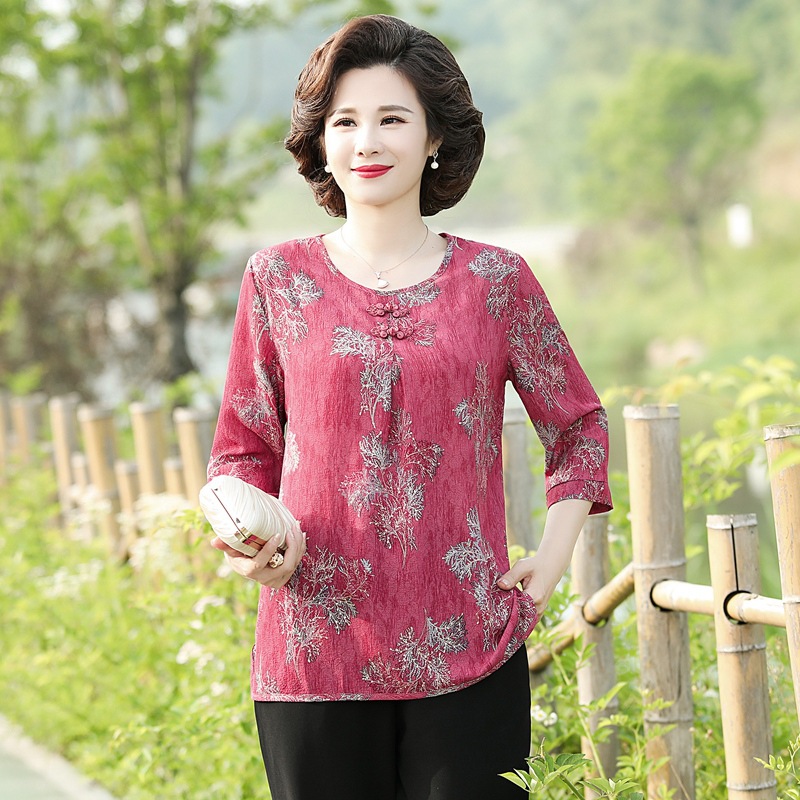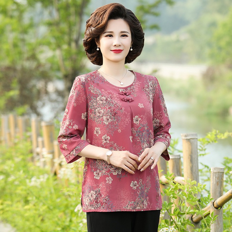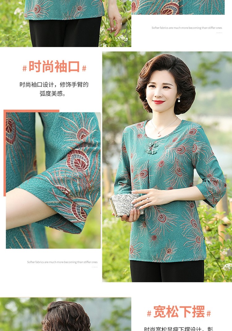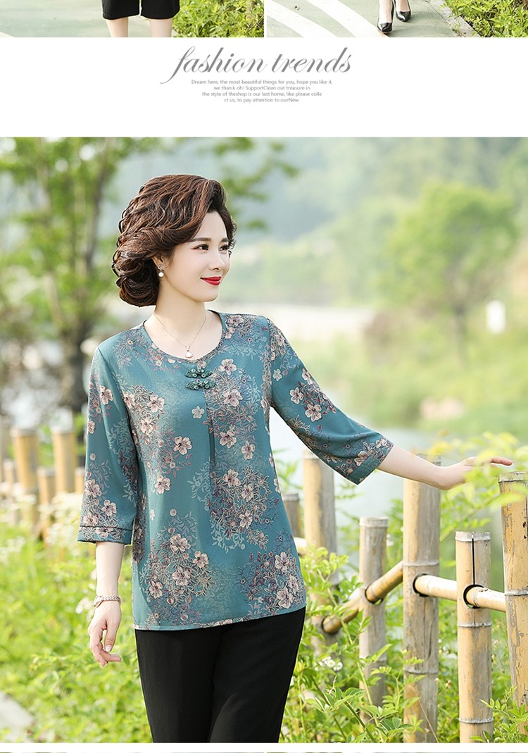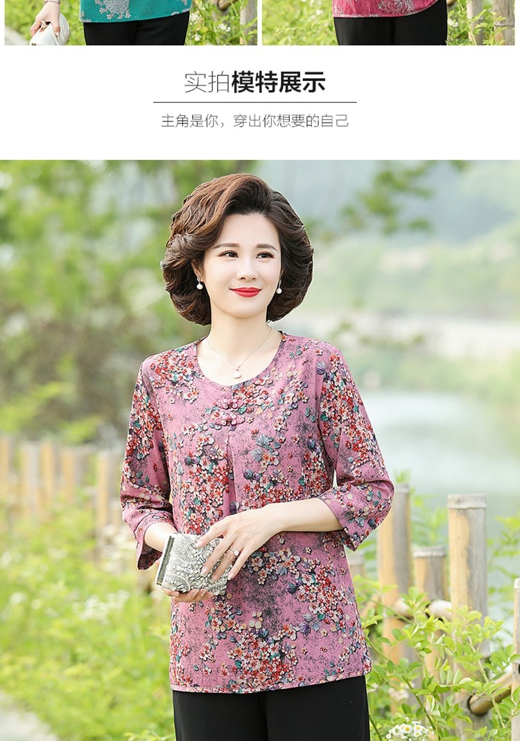 妈妈夏装新款T恤七分袖印花上衣中老年女装宽松大码打底衫薄款