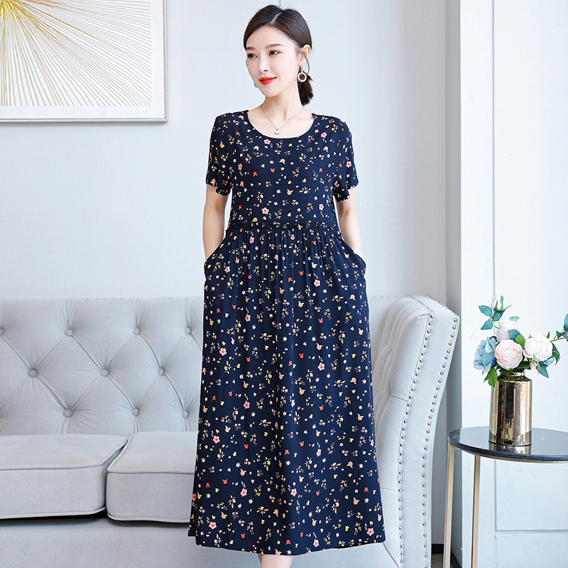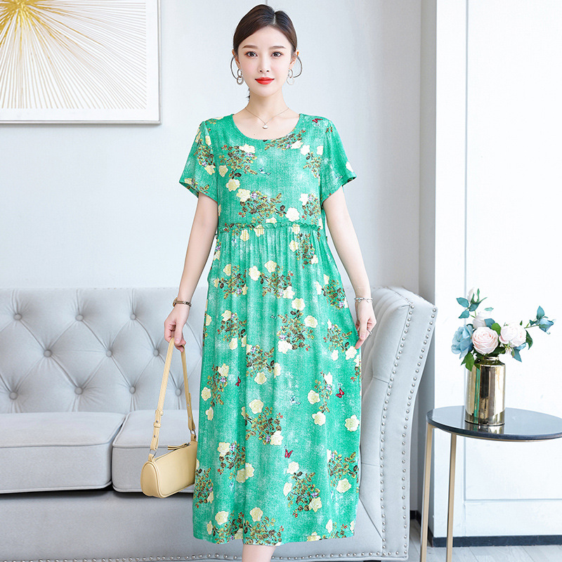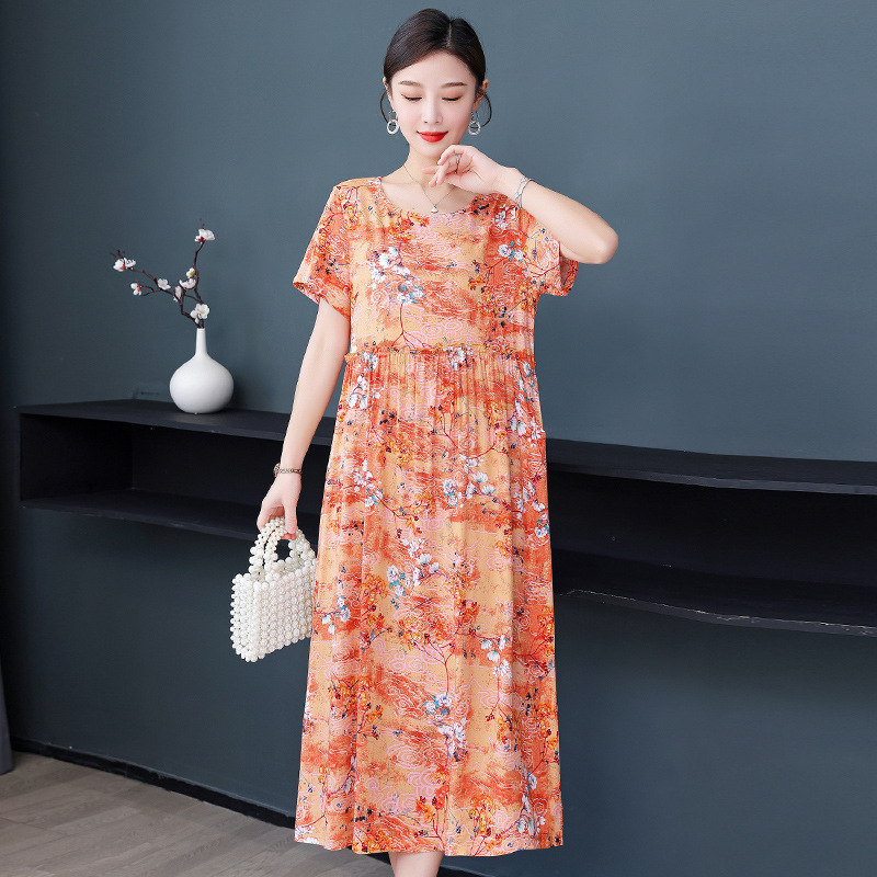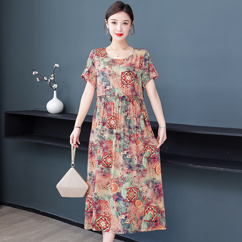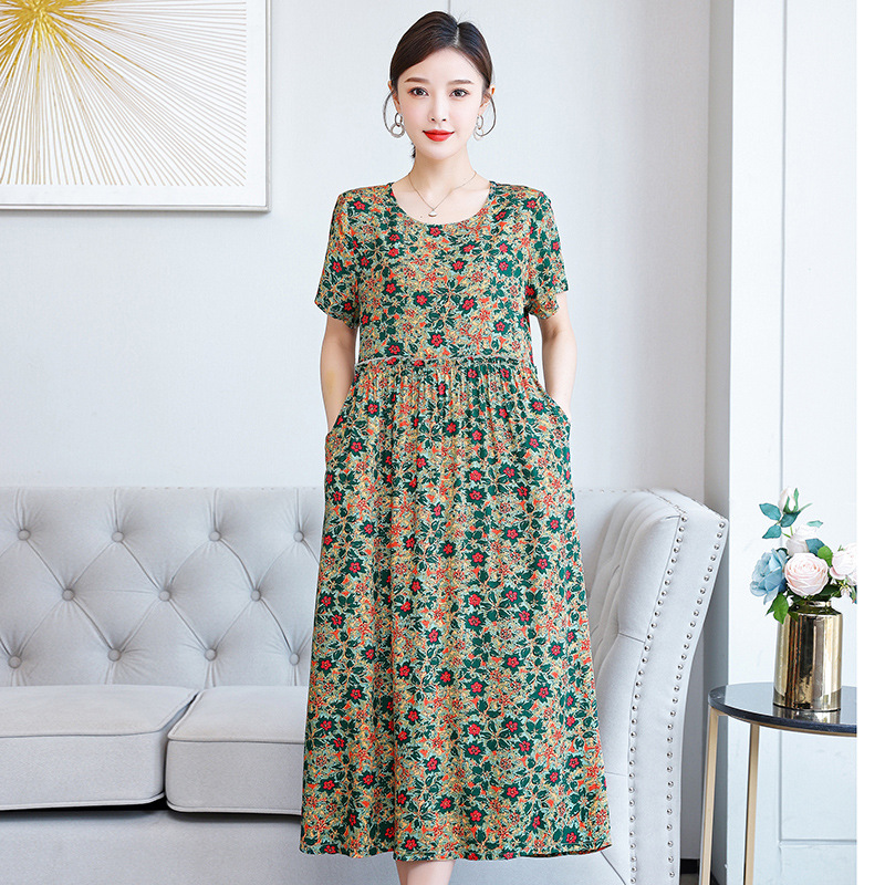 夏装2022年新款女装短袖洋气时尚气质宽松显瘦碎花棉绸连衣裙
