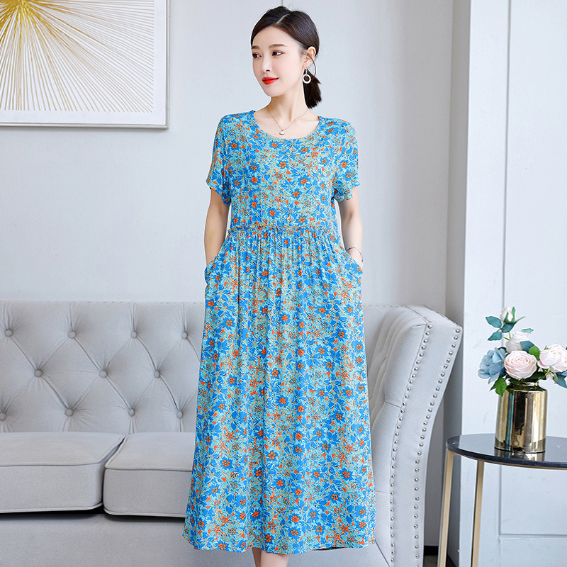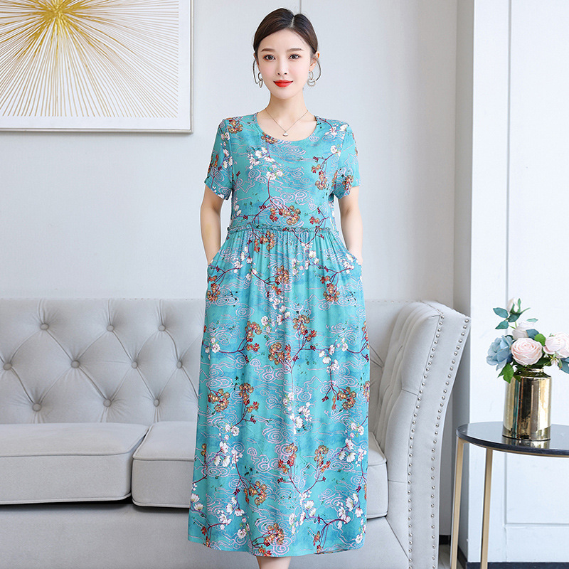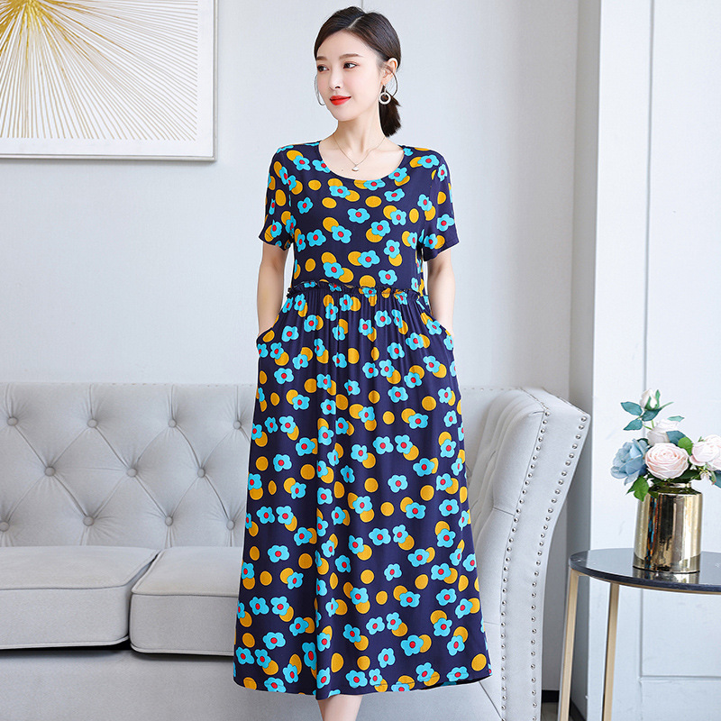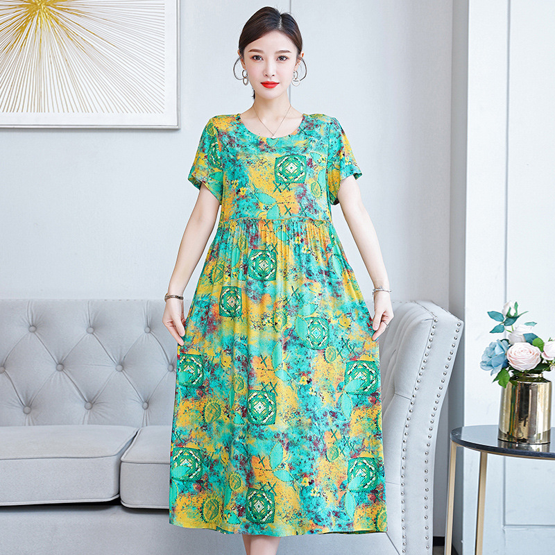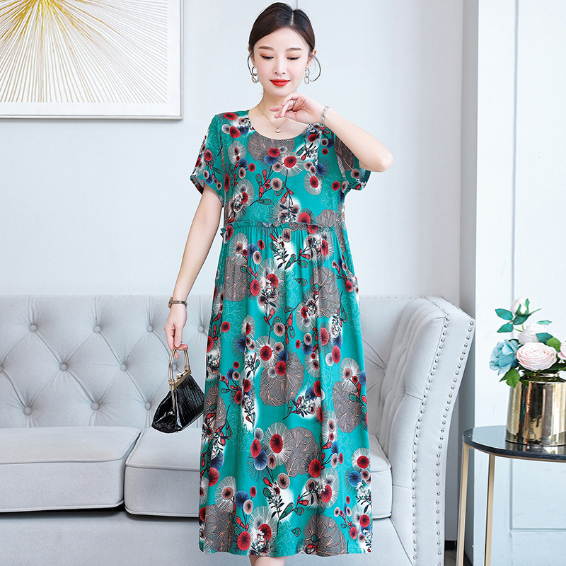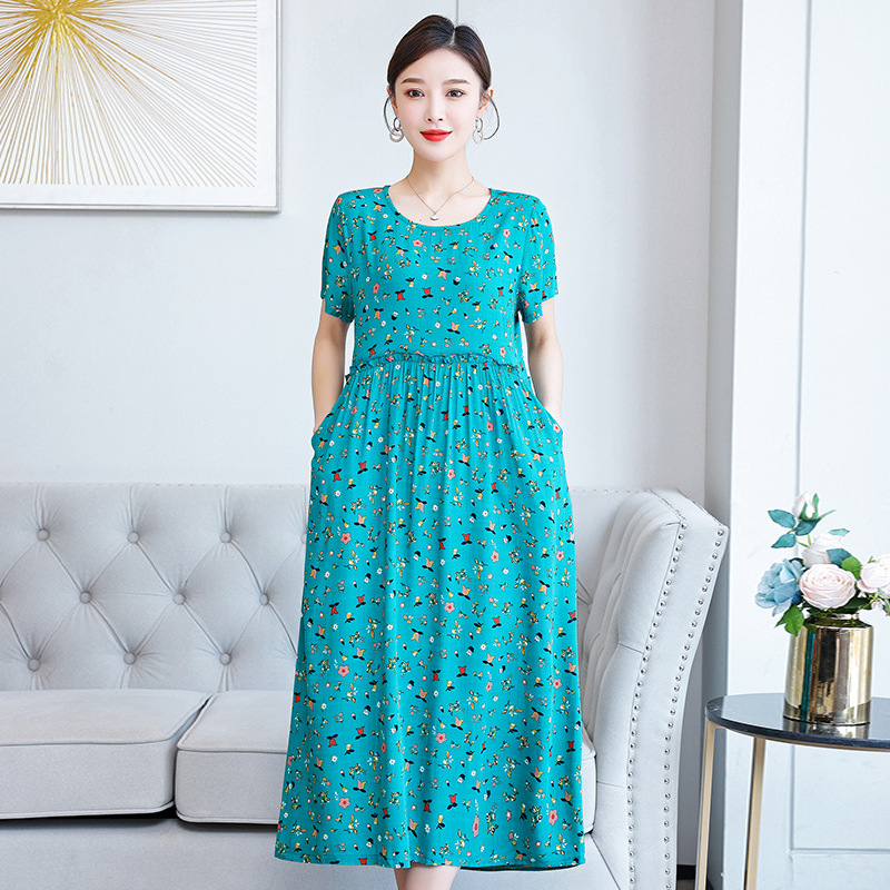 夏装2022年新款女装短袖洋气时尚气质宽松显瘦碎花棉绸连衣裙