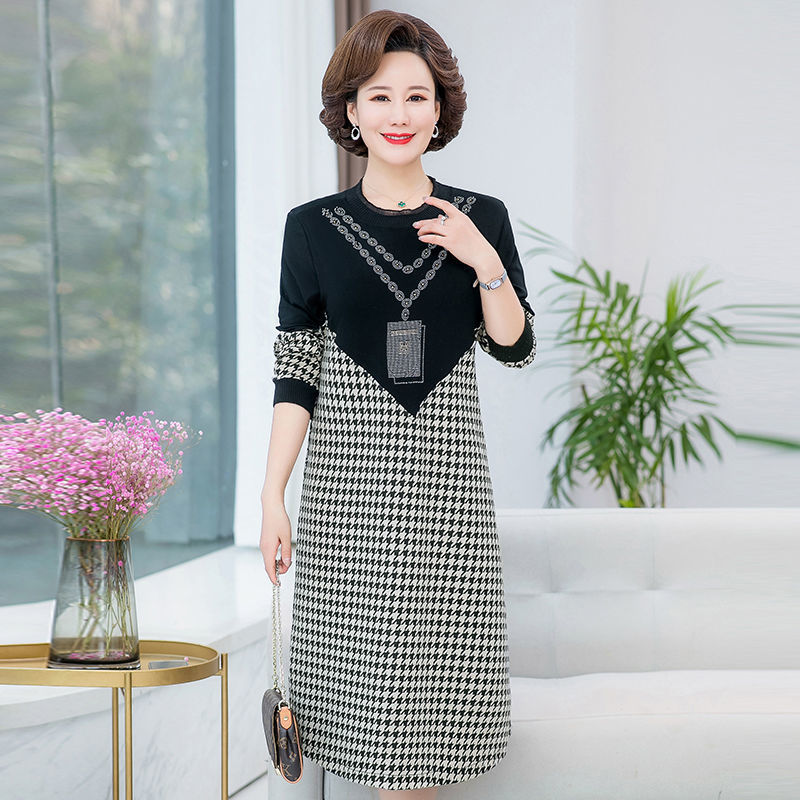 中老年妈妈毛衣裙女春季新款中长款毛衫连衣裙法式高端千鸟格裙子