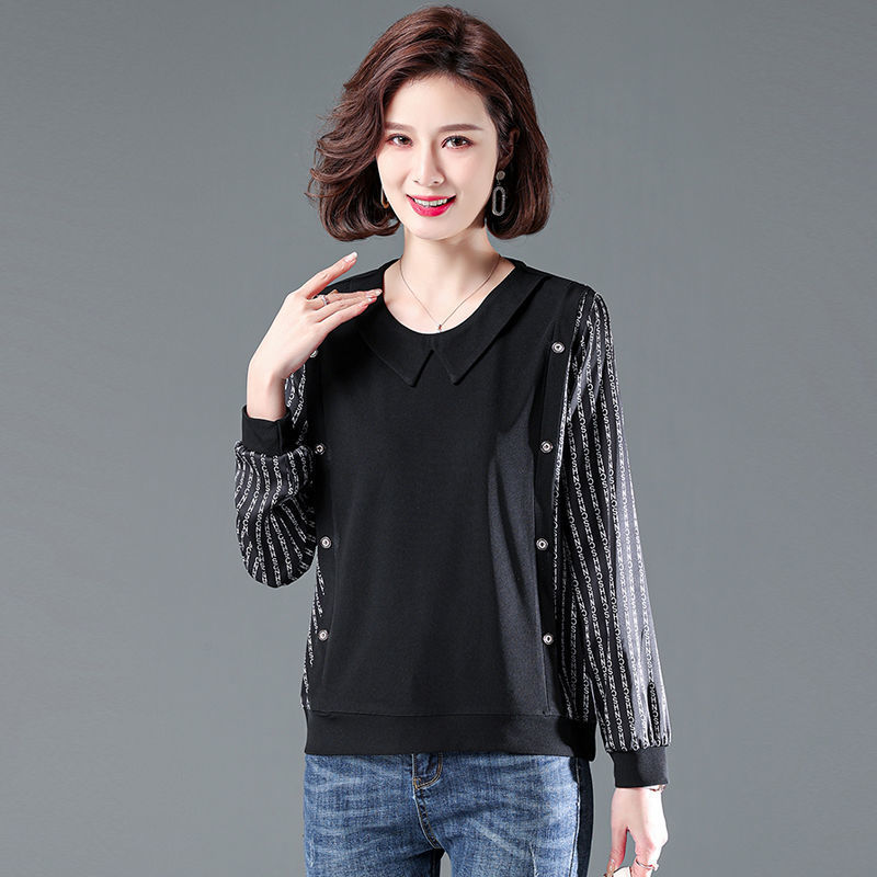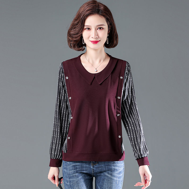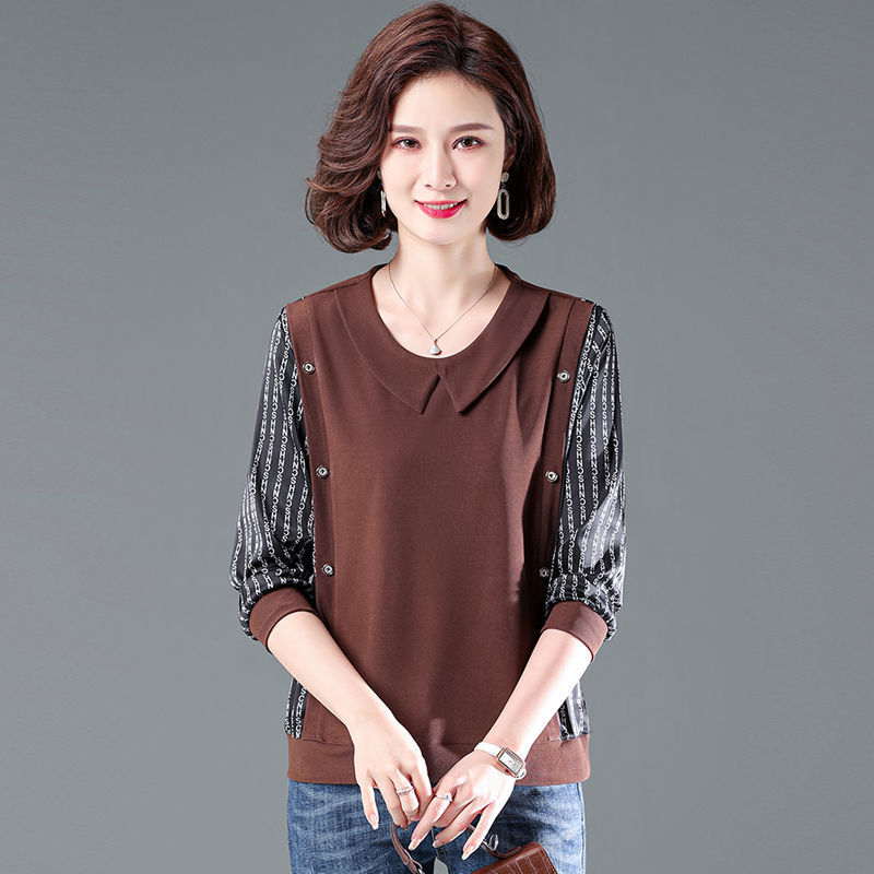 中年妈妈春秋装大码女装娃娃领t恤拼接显瘦长袖气质洋气小衫