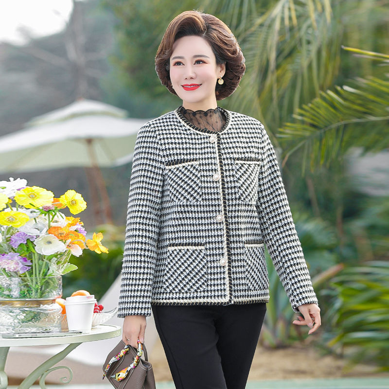 2022新款妈妈春装外套短款小香风时尚中老年女春秋季格子上衣洋气