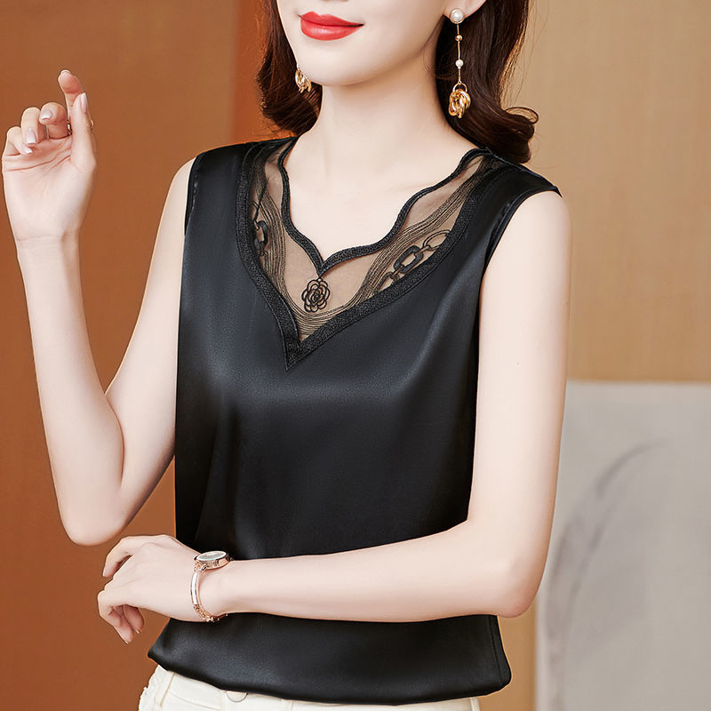 蕾丝吊带背心女春夏新款西装内搭无袖上衣大码V领缎面外穿打底衫