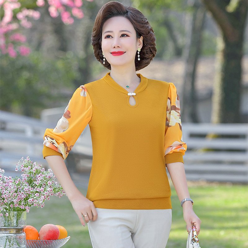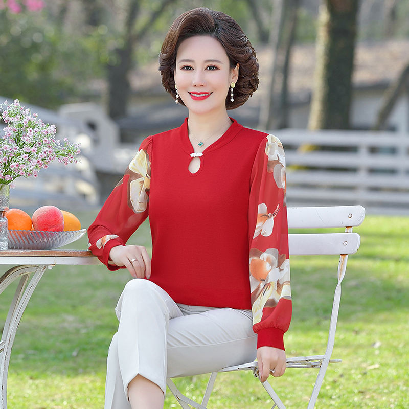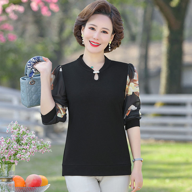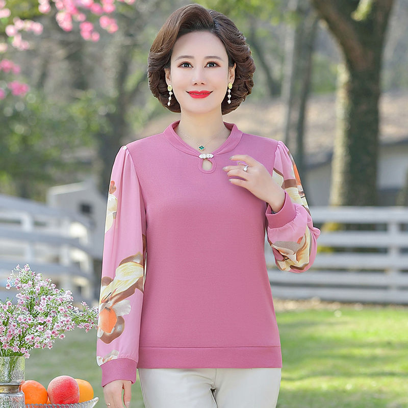 妈妈装春装新款长袖打底衫薄款洋气上衣2022新款印花T恤50岁60岁
