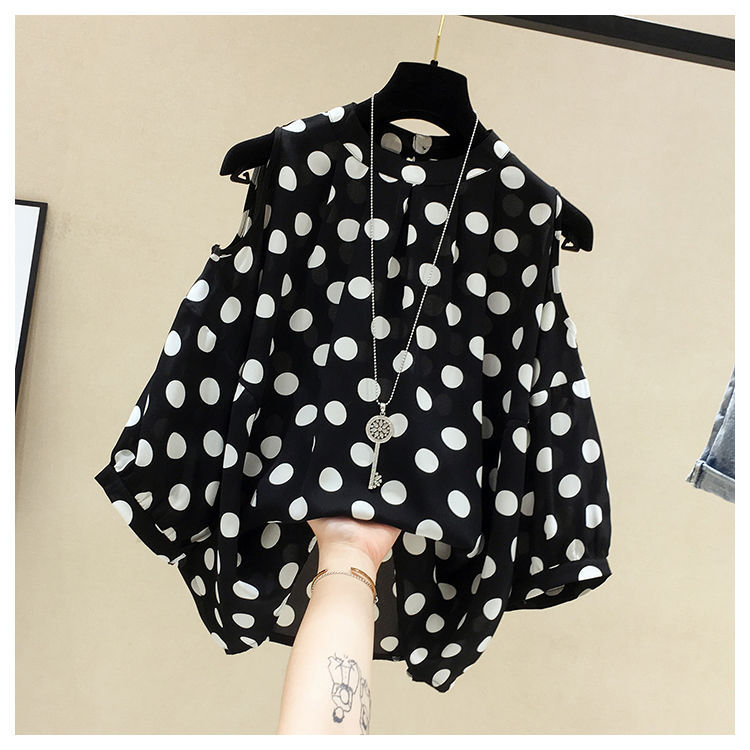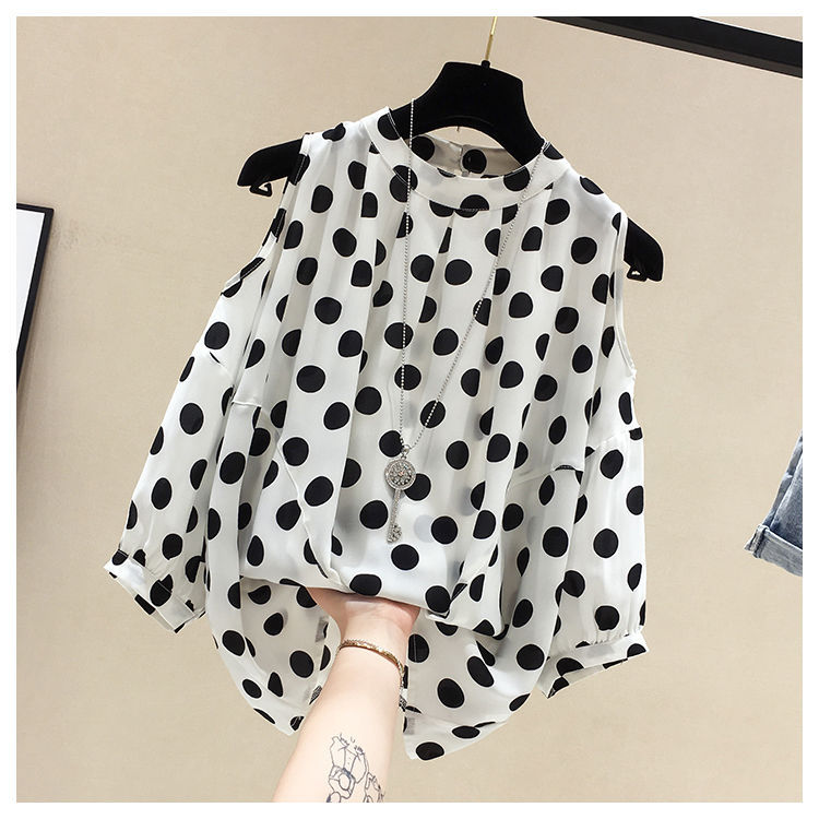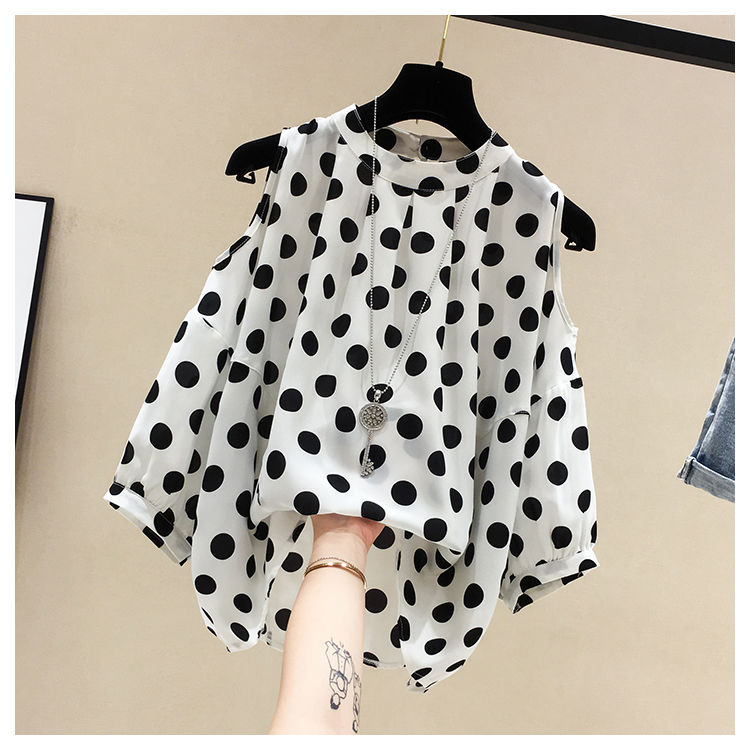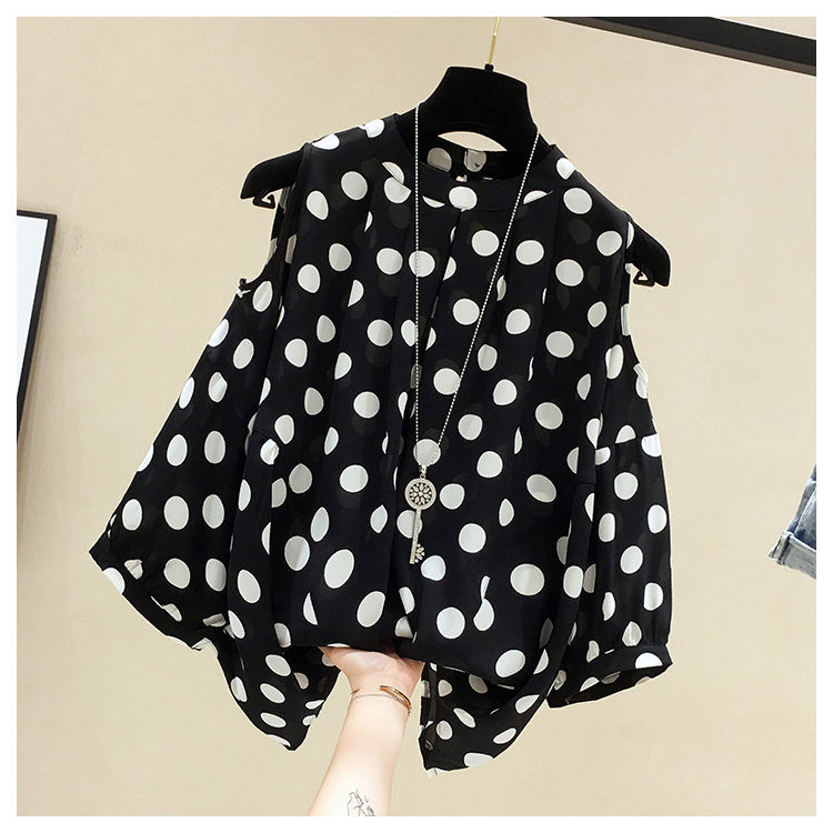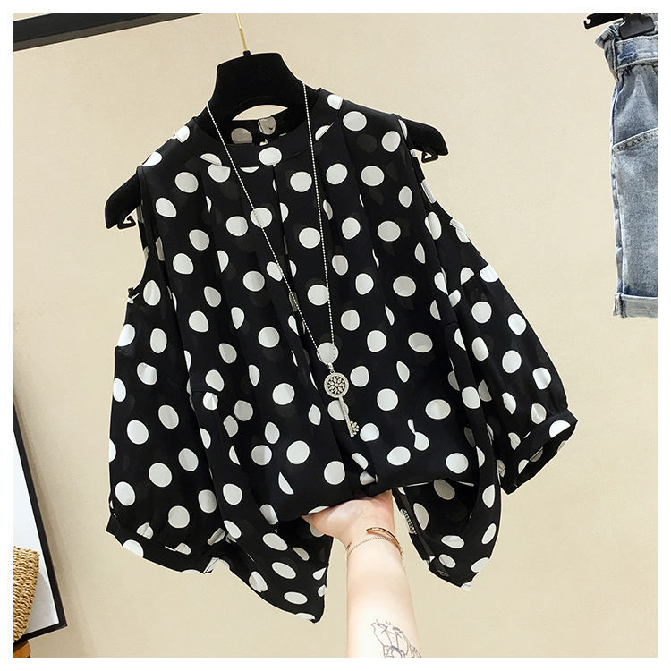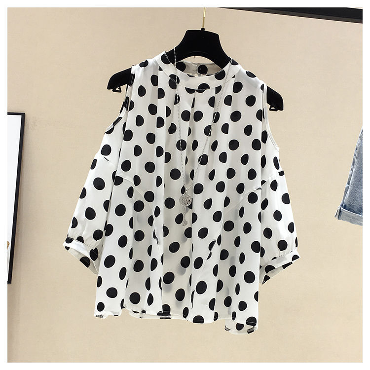 大码女装夏季新款胖妹妹宽松显瘦遮肚子上衣波点露肩短袖雪纺衬衫