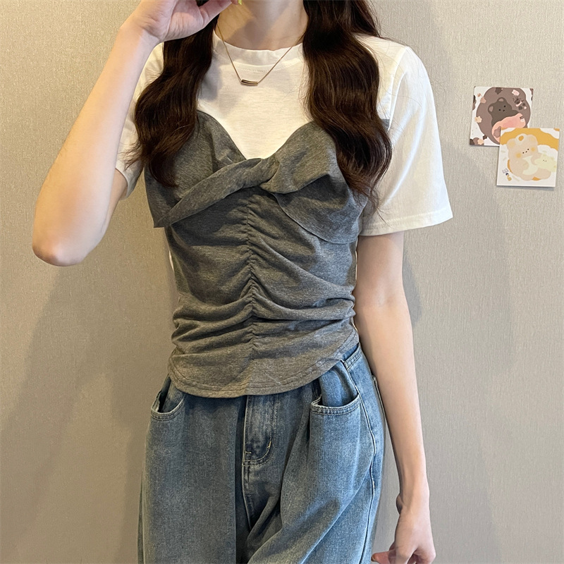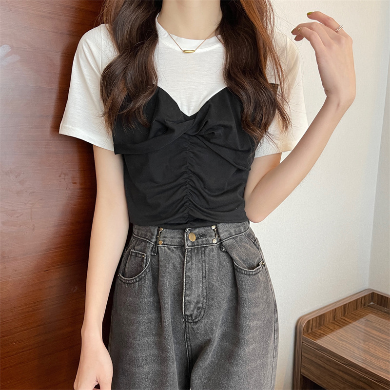 设计感褶皱时尚短袖T恤女2022夏季新款韩版宽松撞色上衣