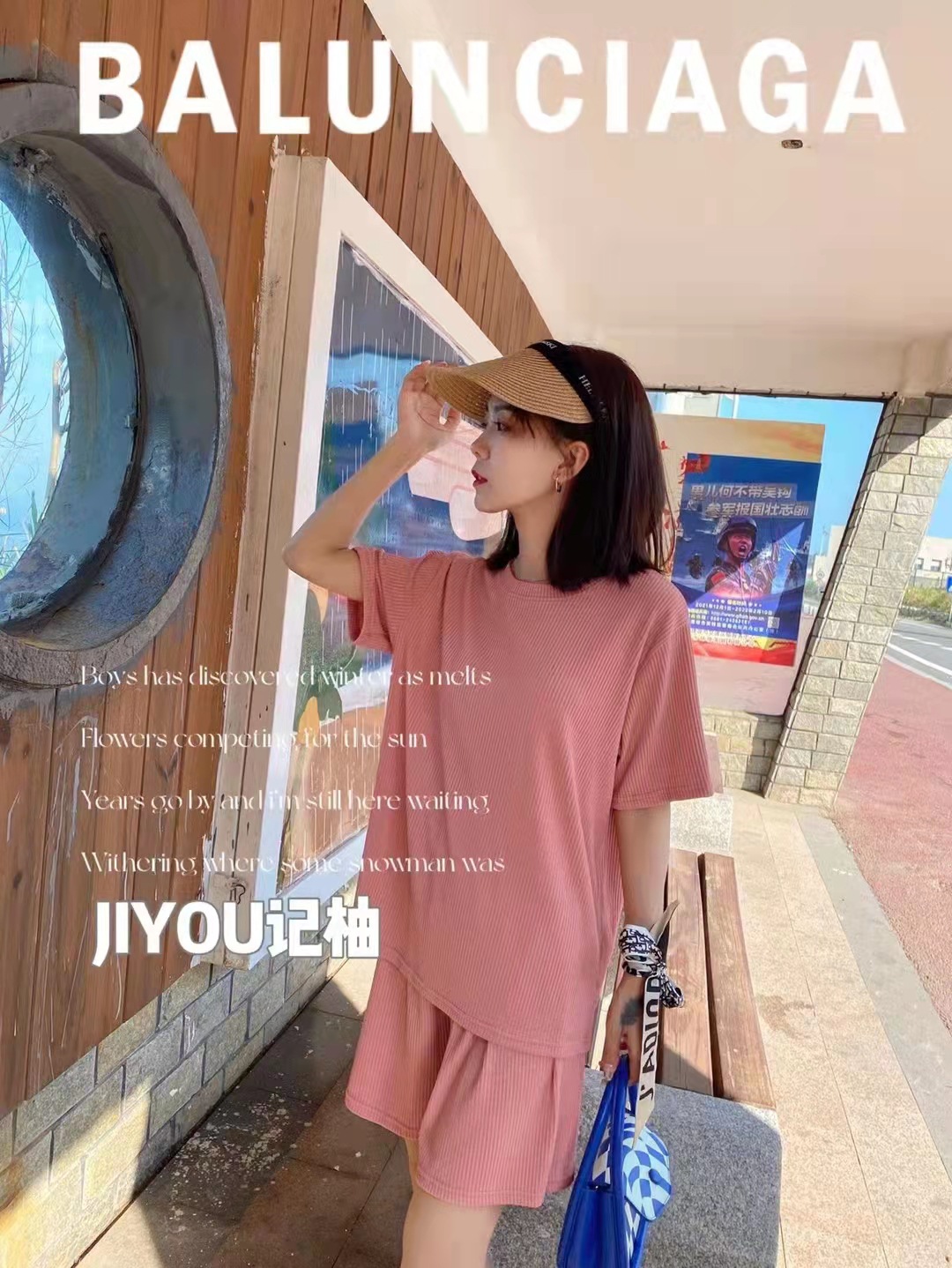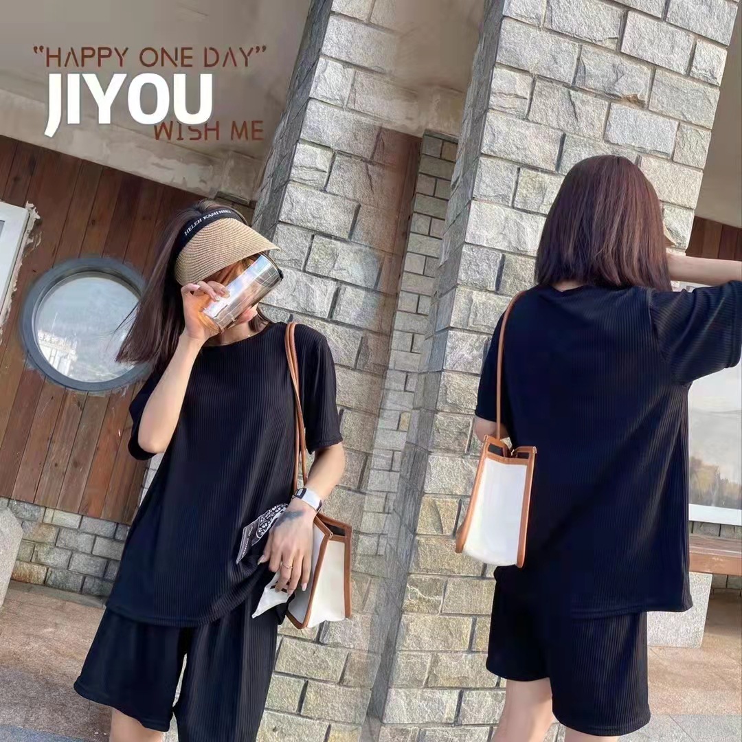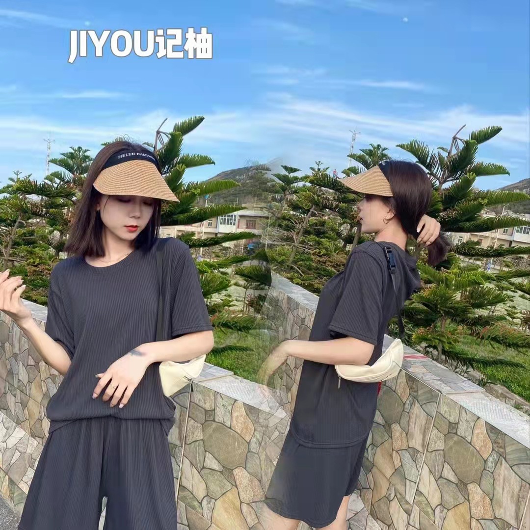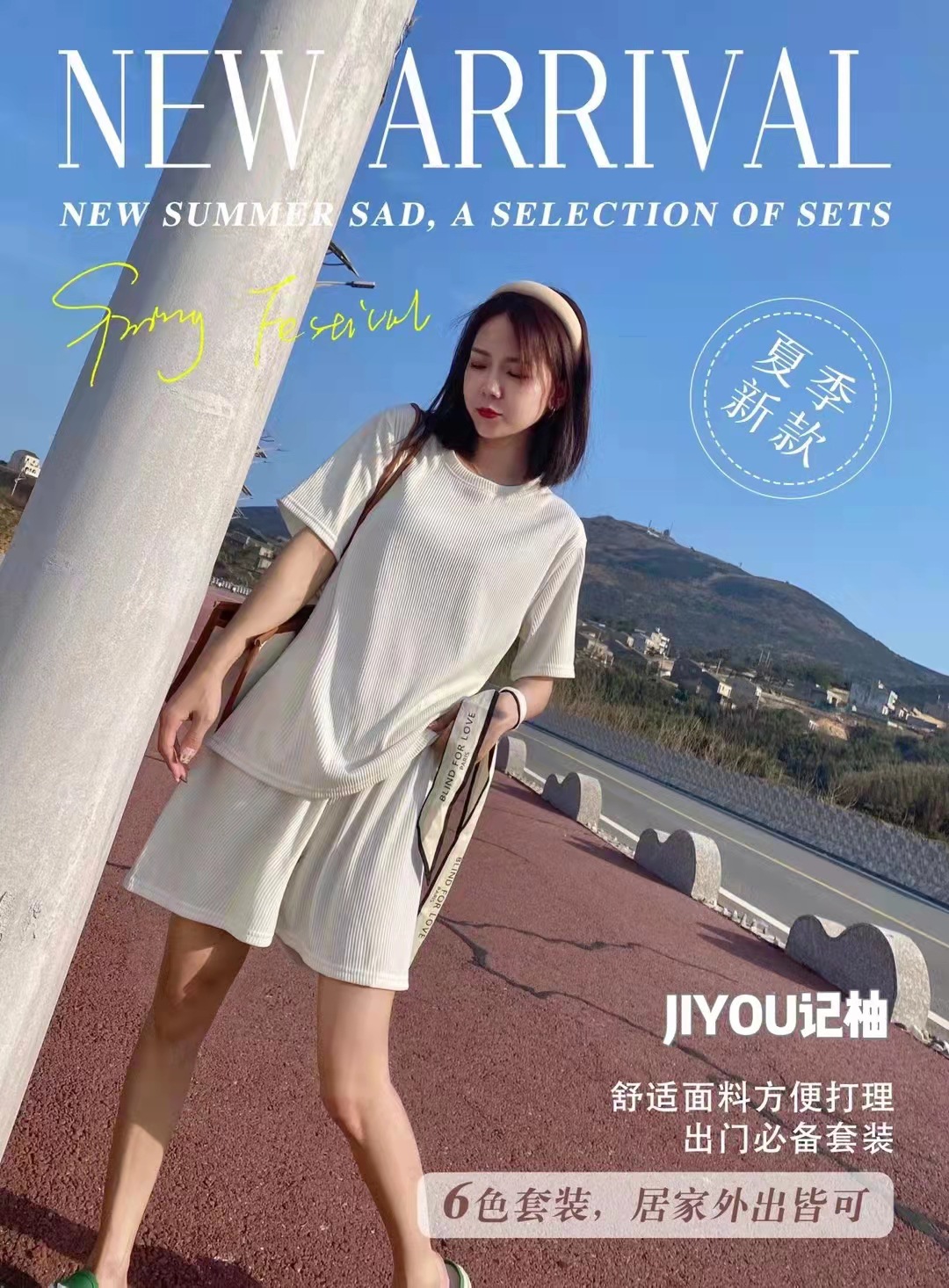 新款JIYOU记柚6色套装简约百搭时尚短袖女两件套居家日常休闲套装