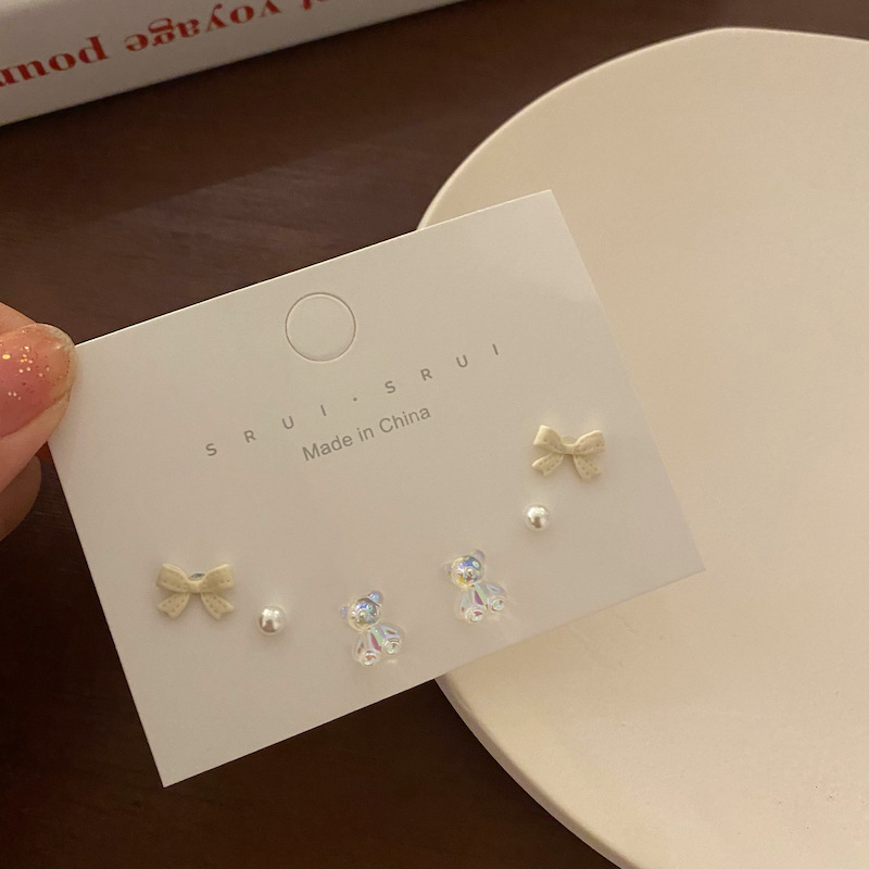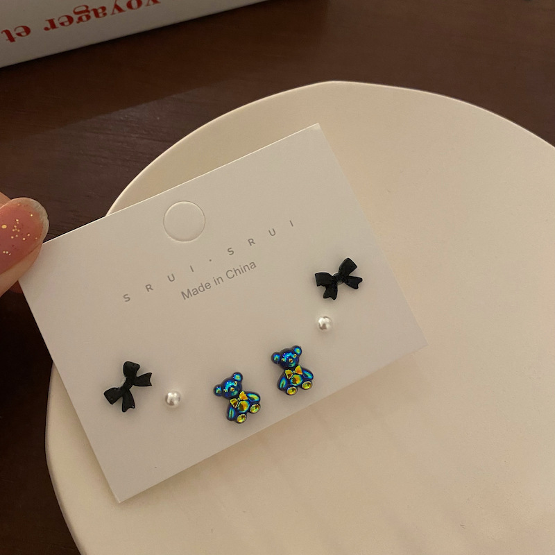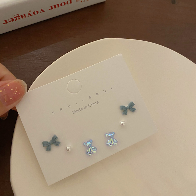 银针可爱甜美蝴蝶结极光小熊耳钉三件套装组合少女心小众耳环耳饰