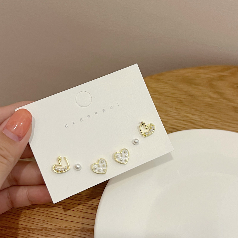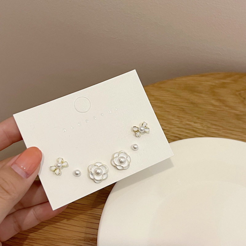 s925银针白色山茶花珍珠爱心耳钉套装2022年新款潮小众设计感耳环