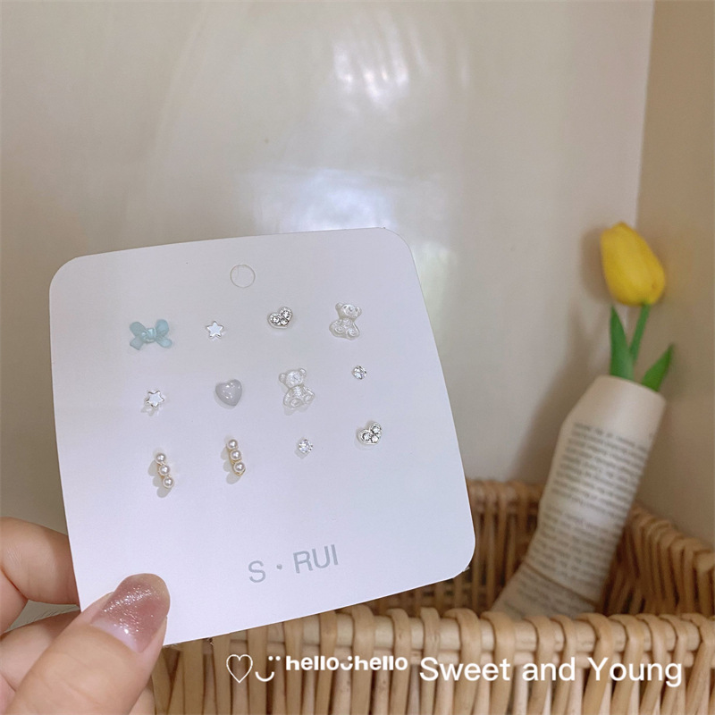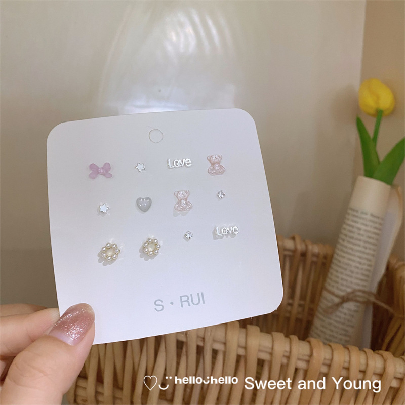 S925银针韩范蝴蝶结小熊珍珠耳钉套装新潮少女风耳饰简约可爱耳环