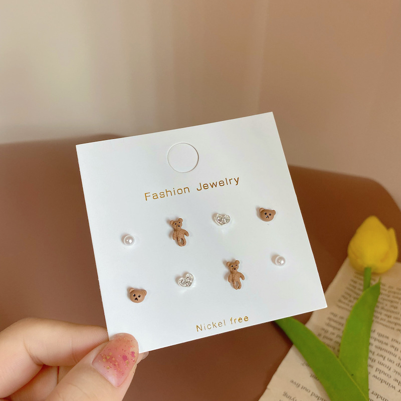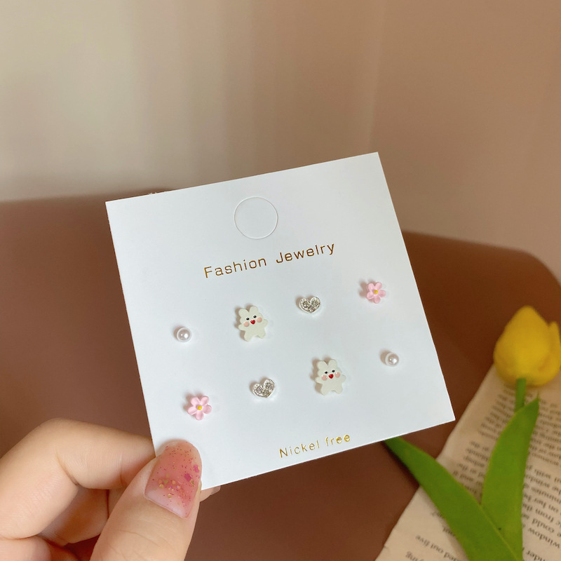 s925银针可爱小熊兔子花朵耳钉套装小众设计感ins风学生耳环耳饰