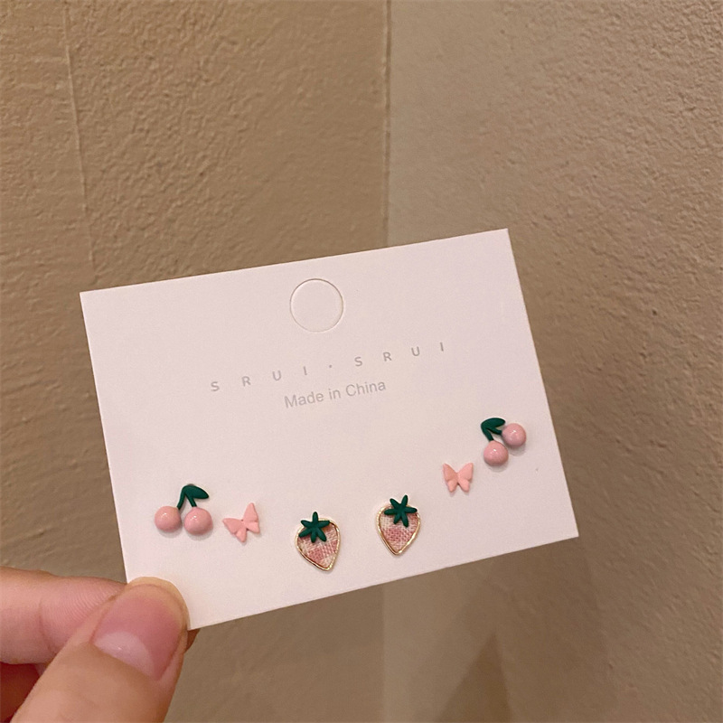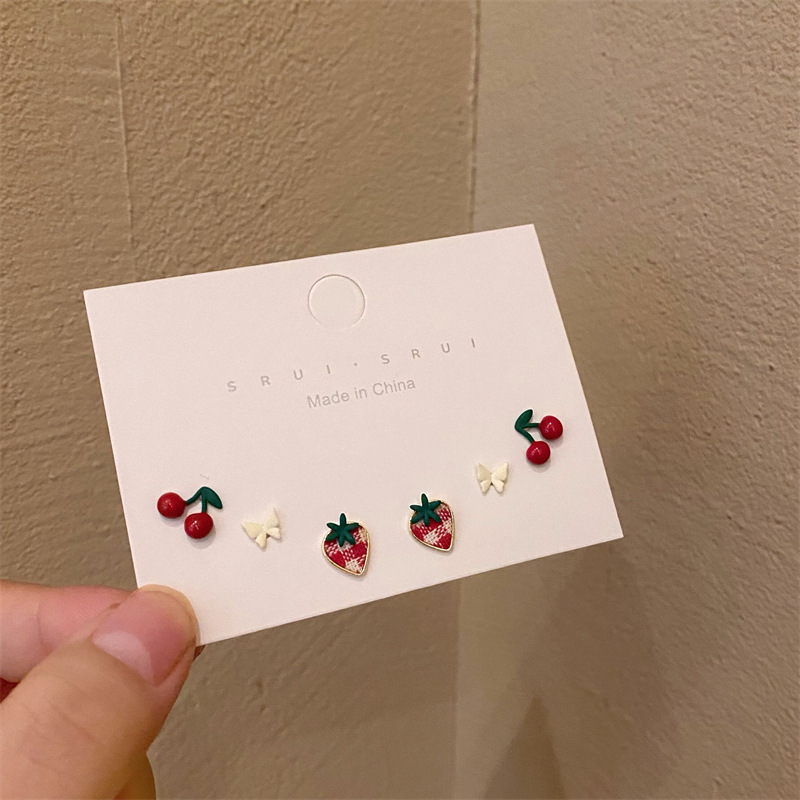 s925银针可爱蝴蝶樱桃草莓耳钉三件套装小众设计感简约女小巧耳环
