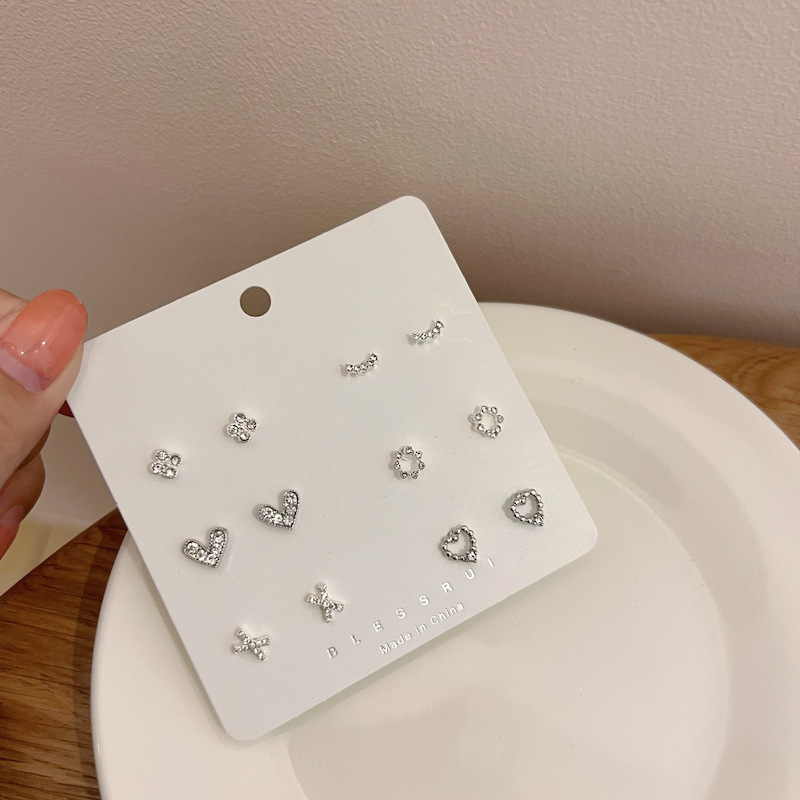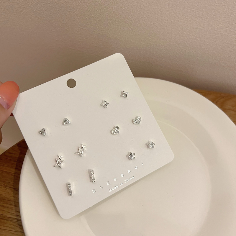 s925银针简约小巧带钻迷你耳钉套装组合女几何爱心耳饰睡觉不用摘