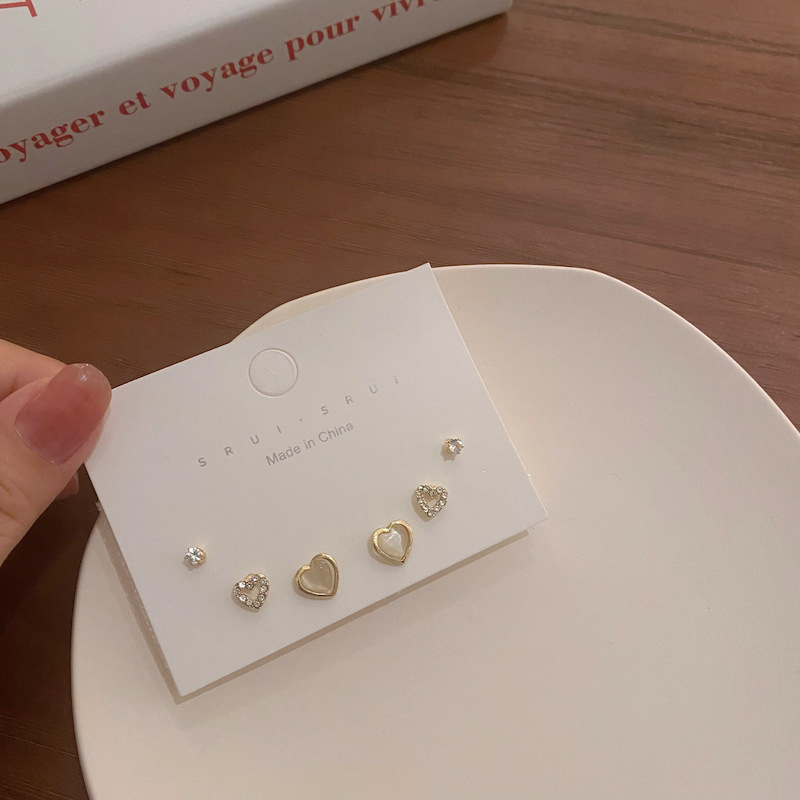s925银针猫眼石满钻爱心耳钉套装少女温柔气质高级感轻奢小巧耳环