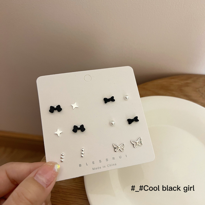 s925银针黑色蝴蝶结耳钉套装组合个性暗黑几何简约百搭新款耳饰品