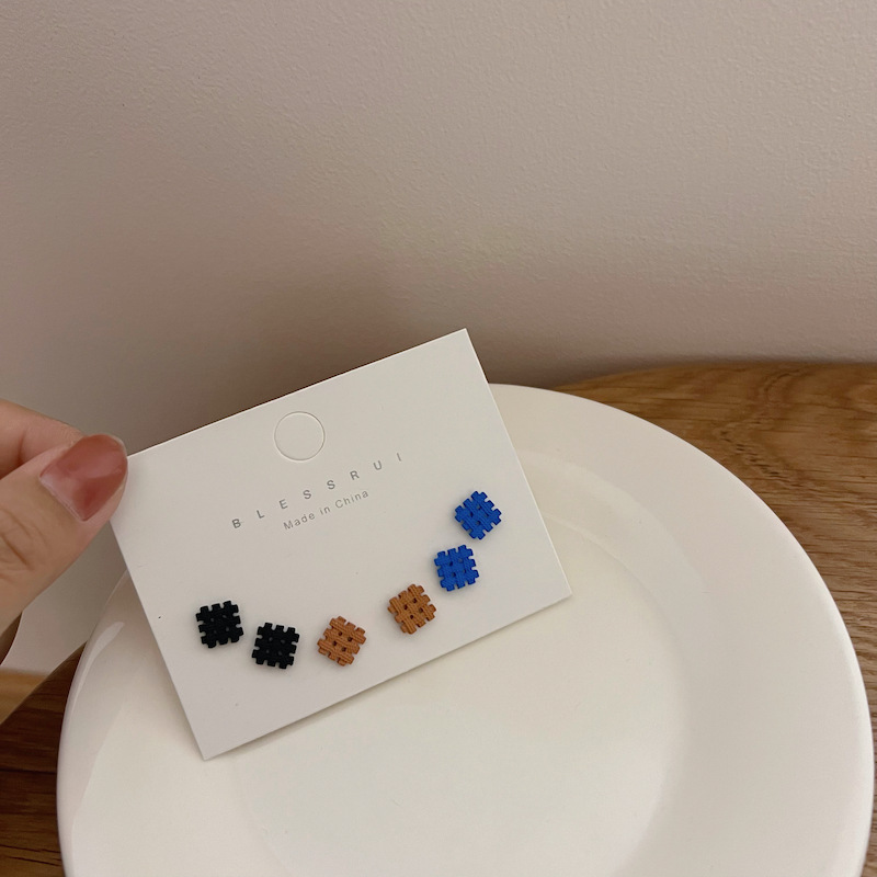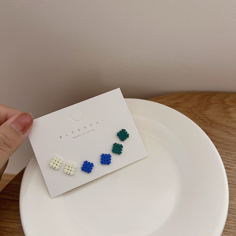 s925银针克莱因蓝编织彩色方块耳钉套装组合女小众设计感气质耳环