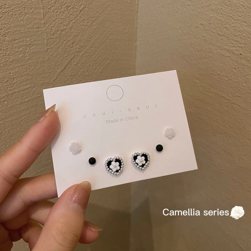 s925银针赫本小香风气质珍珠山茶花爱心耳钉套装高级感精致耳环女