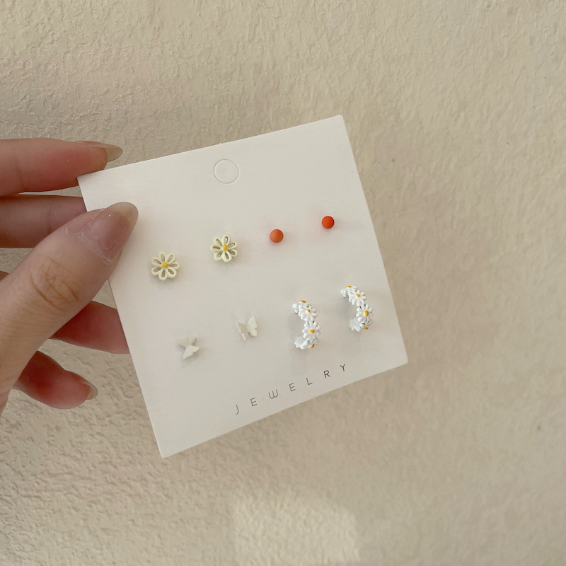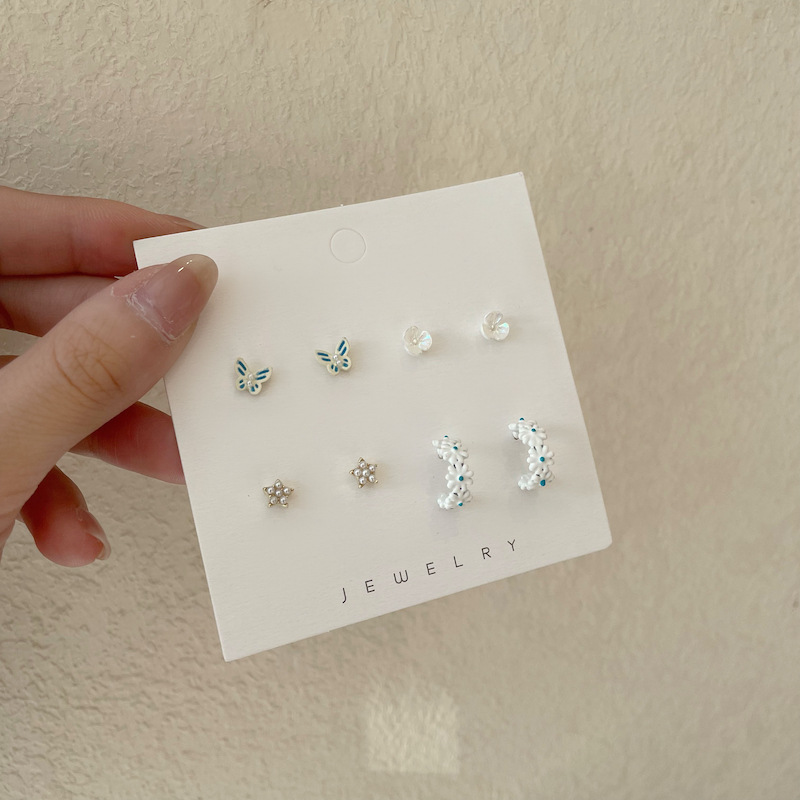 s925银针花朵蝴蝶春夏一周耳钉套装组合少女心小众设计感耳环