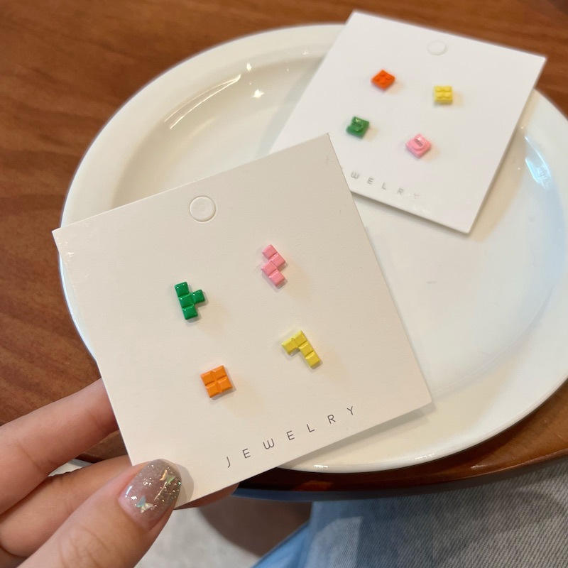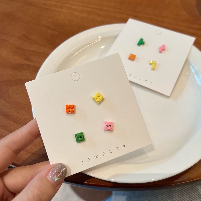 s925银针彩色创意几何拼图积木耳钉套装组合小众设计感可爱耳